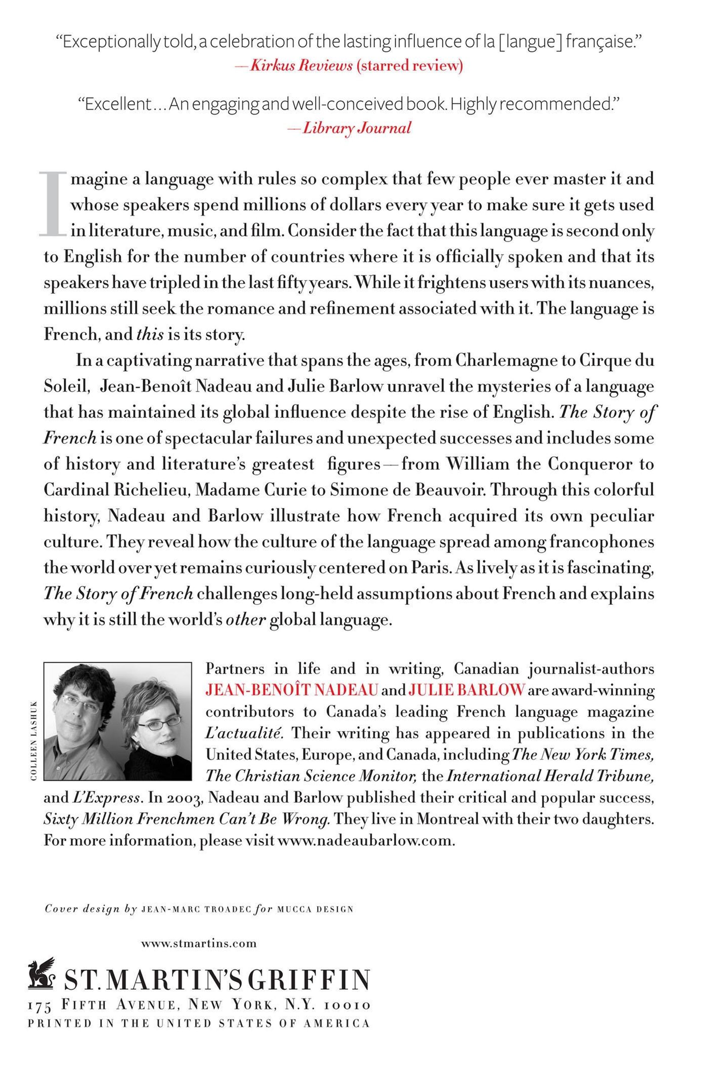 In a captivating narrative that spans the ages, from Charlemagne to Cirque du Soleil, Jean-Benoît Nadeau and Julie Barlow unravel the mysteries of a language that has maintained its global influence despite the rise of English. As in any good story, The Story of French has spectacular failures, unexpected successes and bears traces of some of history's greatest figures: the tenacity of William the Conqueror, the staunchness of Cardinal Richelieu, and the endurance of the Lewis and Clark expedition.