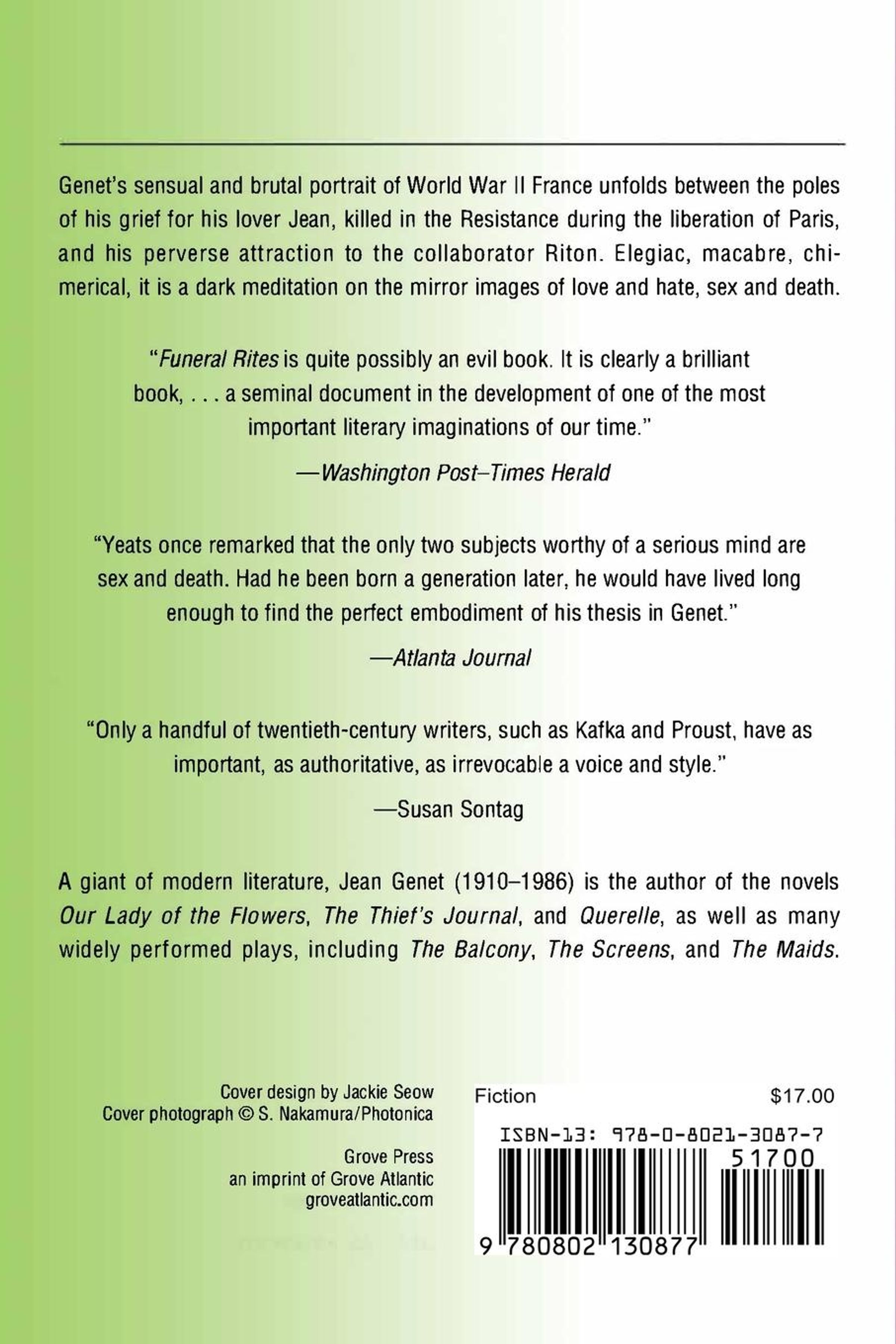 Genet's sensual and brutal portrait of World War II France unfolds between the poles of his grief for his lover Jean, killed in the Resistance during the liberation of Paris, and his perverse attraction to the collaborator Riton. Elegiac, macabre, chimerical, it is a dark meditation on the mirror images of love and hate, sex and death.