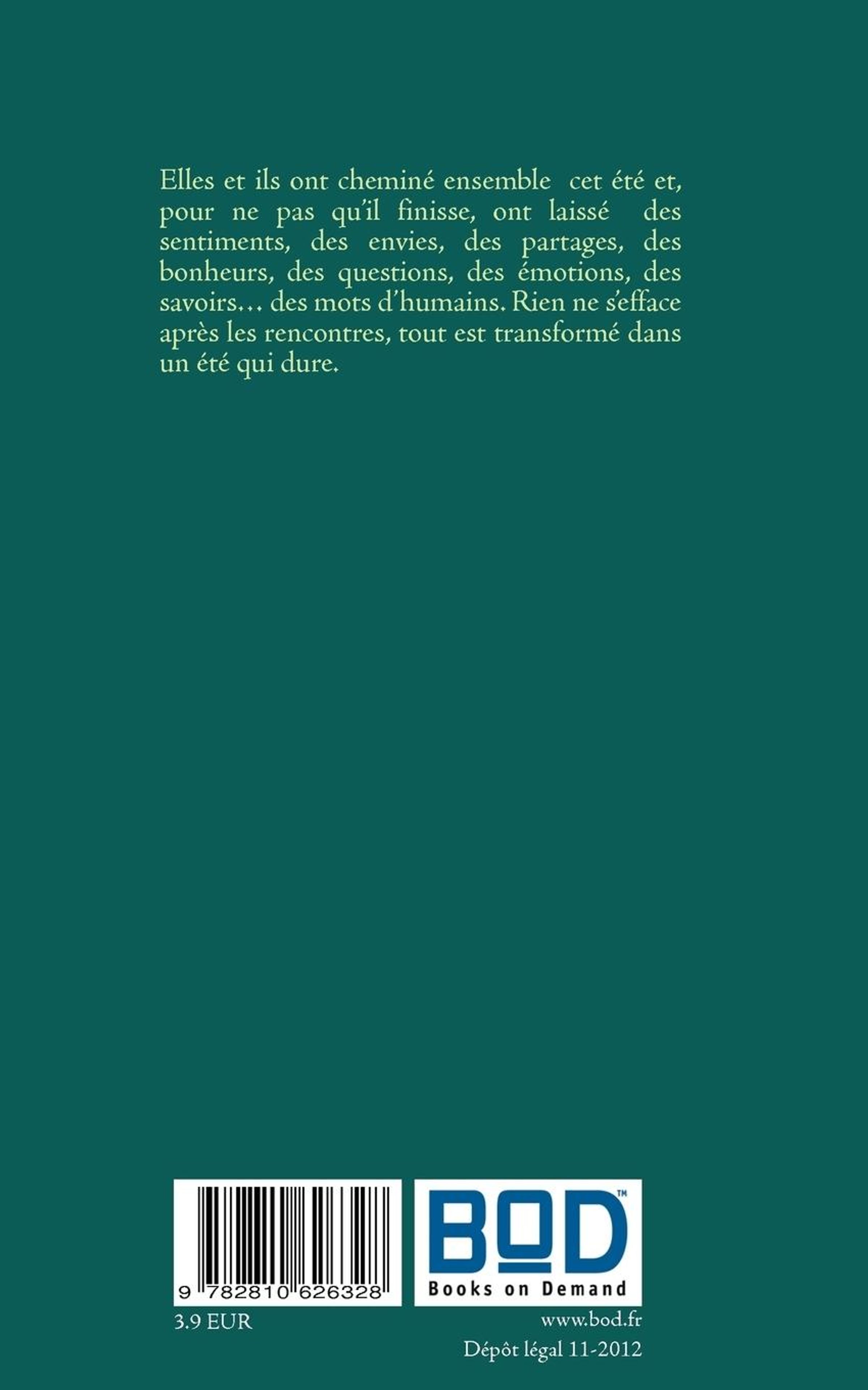 Elles et ils ont cheminé ensemble cet été et, pour ne pas qüil finisse, ont laissé des sentiments, des envies, des partages, des bonheurs, des questions, des émotions, des savoirs¿ des mots d¿humains. Rien ne s¿efface après les rencontres, tout est transformé dans un été qui dure.