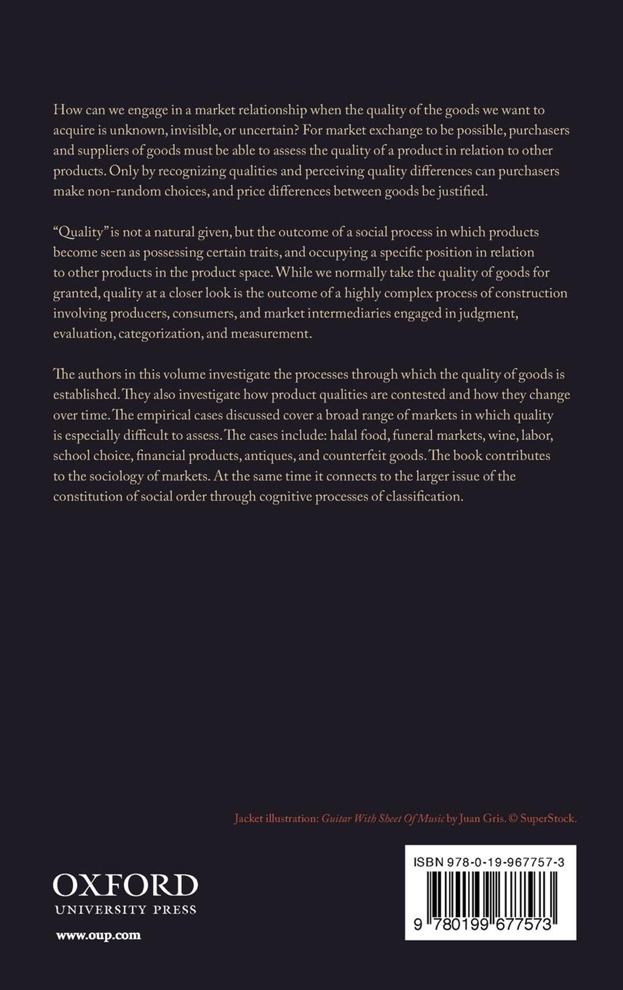 The authors in this volume investigate the processes through which the quality of goods is established. They also investigate how product qualities are contested and how they change over time. The empirical cases discussed cover a broad range of markets in which quality is especially difficult to assess. The cases include: halal food, funeral markets, wine, labor, school choice, financial products, antiques, and counterfeit goods. The book contributes to the sociology of markets. At the same time it connects to the larger issue of the constitution of social order through cognitive processes of classification.