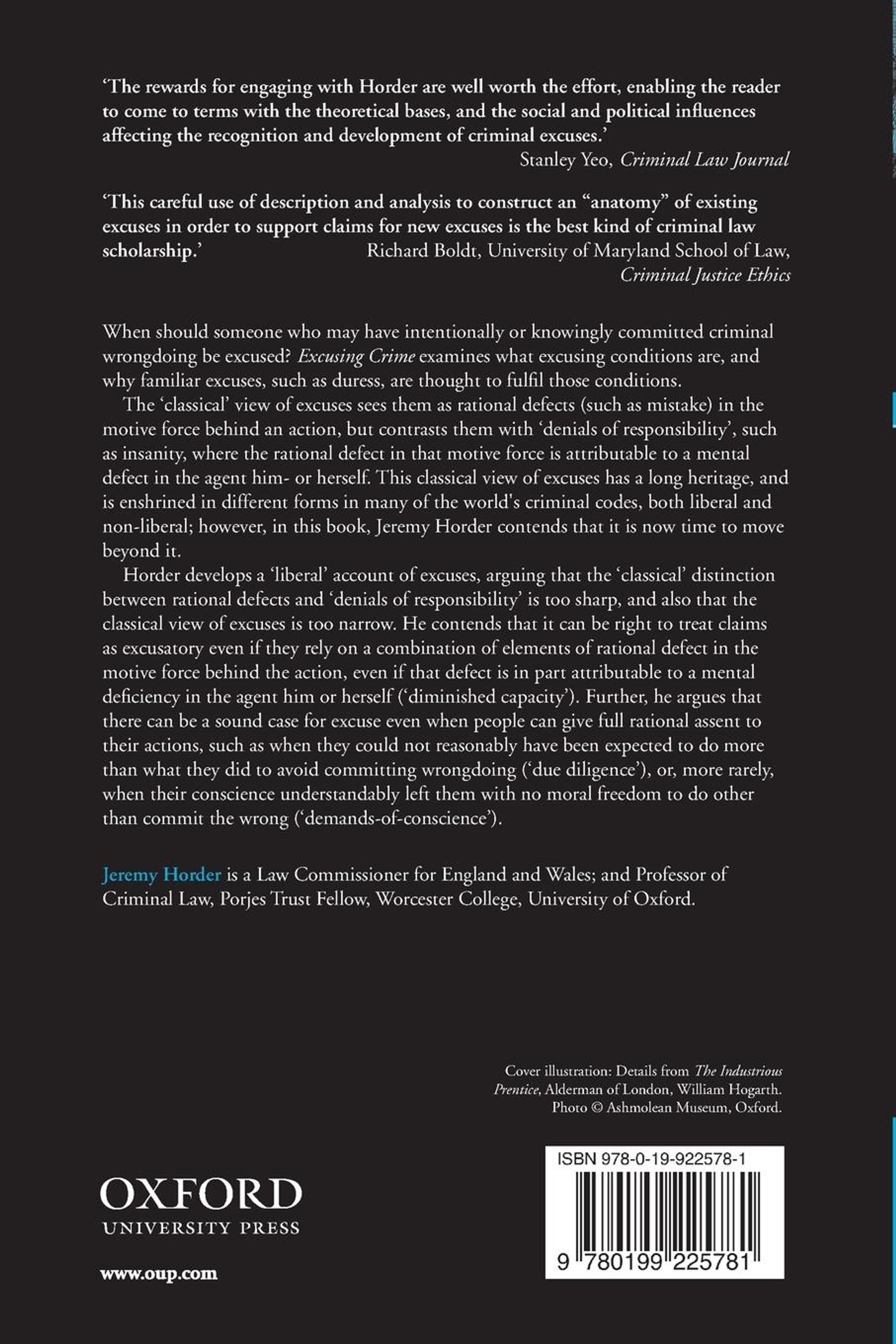 When should someone who may have intentionally or knowingly committed criminal wrongdoing be excused? Excusing Crime examines what excusing conditions are, and why familiar excuses, such as duress, are thought to fulfil those conditions. Jeremy Horder argues that a wider range of excuses - 'diminished capacity', 'due diligence' and 'demands of conscience' - should be recognised in law.