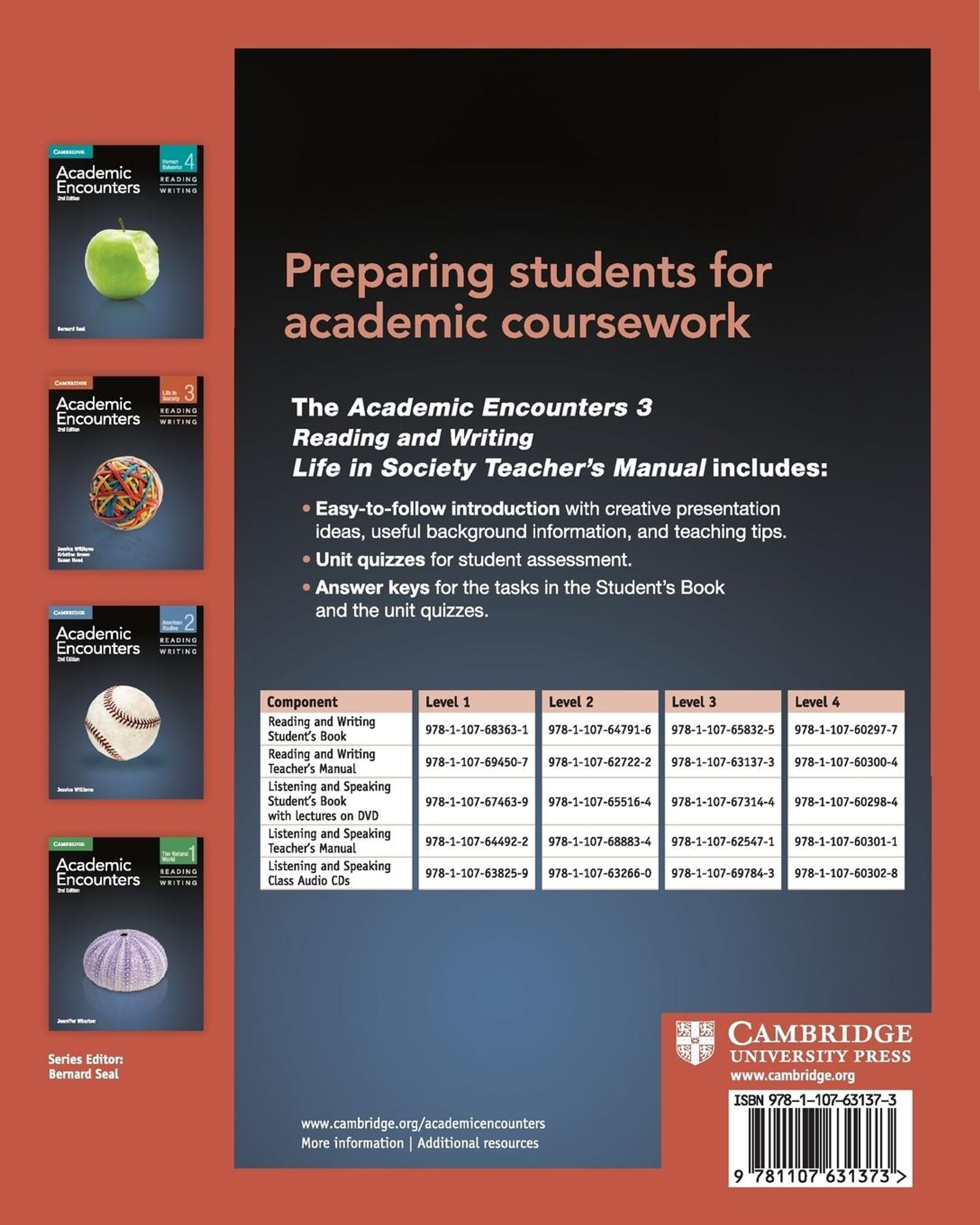 Academic Encounters Second edition is a paired skills series with a sustained content approach to teach skills necessary for taking academic courses in English. Academic Encounters Level 3 Teacher's Manual Reading and Writing Life in Society will contain general teaching guidelines for the course, tasks by task teaching suggestions, answers for all tasks, and chapter quizzes and quiz answers.