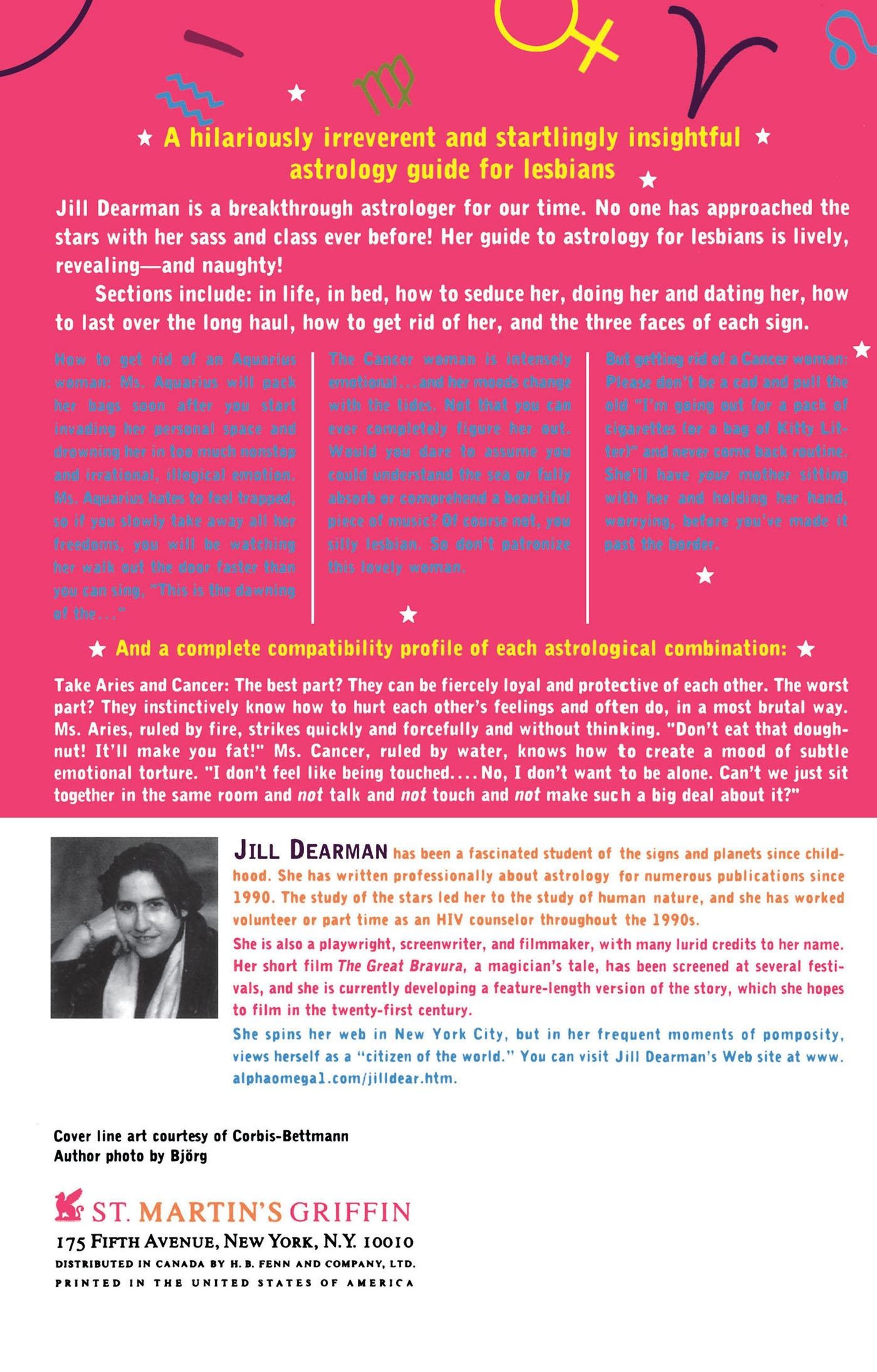 Jill Dearman is a breakthrough astrologer for our time. No one has approached the stars with her sass and class ever before! Her guide to astrology for lesbians is lively, revealing--and naughty!