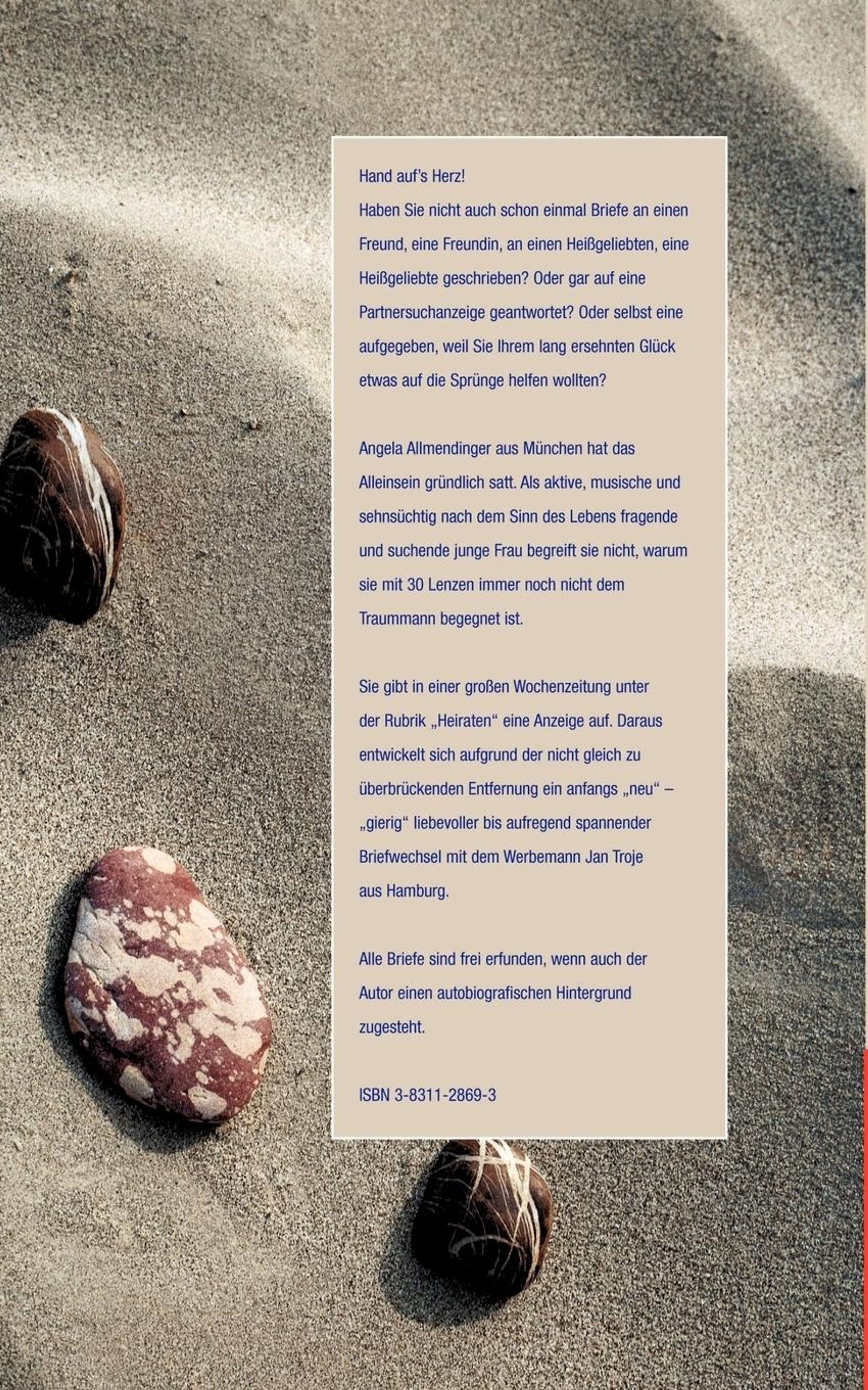 Hand aufs Herz! Haben Sie nicht auch schon einmal Briefe an einen Heißgeliebten, eine Heißgeliebte geschrieben? Oder gar auf eine Partnersuchanzeige geantwortet? Oder selbst eine aufgegeben, weil Sie Ihrem lang ersehnten Glück etwas auf die Sprünge helfen wollten? Angela Allmendinger aus München hat das Alleinsein gründlich satt. Als aktive, musische und sehnsüchtig nach dem Sinn des Lebens fragende und suchende junge Frau begreift sie nicht, warum sie mit 30 Lenzen immer noch nicht dem Traummann begegnet ist. Sie gibt in einer großen Wochenzeitung unter der Rubrik "Heiraten" eine Partnersuchanzeige auf. Daraus entwickelt sich aufgrund der nicht gleich zu überbrückenden Entfernung ein anfangs "neu" -"gierig" liebevoller bis aufregend spannender Briefwechsel mit dem Werbemann Jan Troje aus Hamburg. Alle Briefe sind frei erfunden, wenn auch der Autor einen autobiografischen Hintergrund zugesteht.