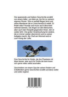 Die spannende und heitere Geschichte erzählt von einem Adler, von klein an, bis hin zu seinem eigenen Revier. Wie er perfekt fliegen lernt und seine Abenteuer, die er zwischendurch erlebt. Er findet viele Freunde uns muss auch Abschied nehmen können. Die Angst vor den Menschen, aber auch den Respekt gegenüber ihnen, den er weiter lehrt. Die große Verantwortung für andere, die er immer wieder übernimmt und zu seiner Aufgabe macht. Als Chef am Himmel wird er zum König der Lüfte.