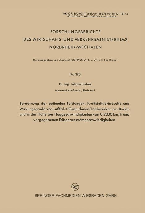 Der Artikel Johann Endres: Berechnung der optimalen Leistungen, Kraftstoffverbräuche und Wirkungsgrade von Luftfahrt-Gasturbinen-Triebwerken am Boden und in der Höhe bei Fluggeschwindigkeiten von 0-2000 km/h und vorgegebenen Düsenausströmgeschwindigkeiten wurde in den Warenkorb gelegt.