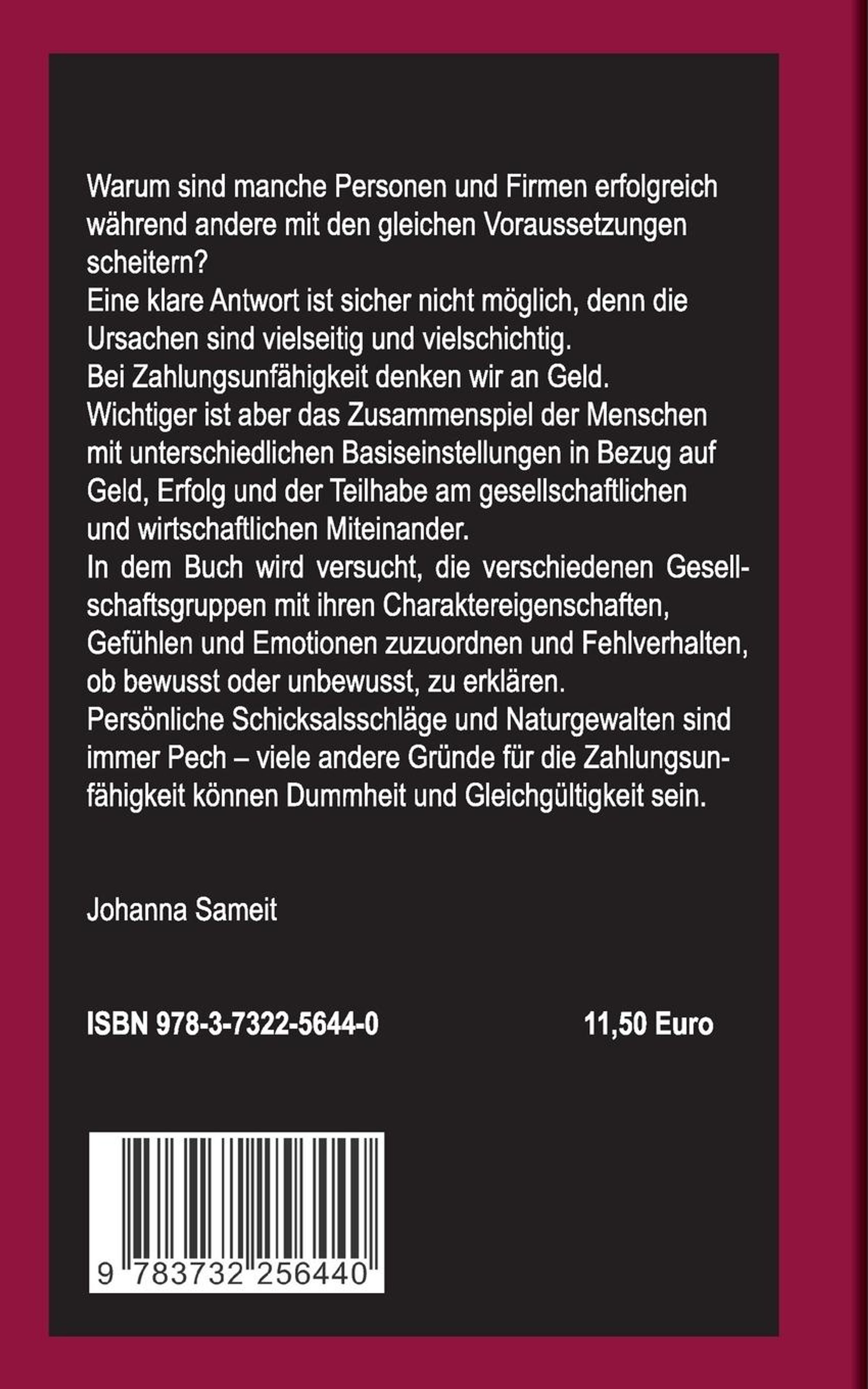 Warum sind manche Personen oder Firmen erfolgreich während andere mit der gleichen Voraussetzung, gutes Startkapital und am Markt nachgefragte Produkte, scheitern? Ein klare Antwort ist sicher nicht möglich, denn die Ursachen sind vielseitig und vielschichtig. Bei "Zahlungsunfähigkeit" denken wir an Geld. Wichtiger ist aber das Zusammenspiel der unterschiedlichen Basiseinstellungen der Menschen in Bezug auf Geld, Erfolg und Teilhabe am gesellschaftlichen und wirtschaftlichen Miteinander. In dem Buch wird versucht, die unterschiedlichen Gesellschaftsgruppen mit ihren Charaktereigenschaften, Gefühlen und Emotionen zuzuordnen und Fehlverhalten, ob bewusst oder unbewusst, zu erklären. Persönliche Schicksalsschläge und Naturgewalten sind immer Pech - viele andere Gründe für die Zahlungsunfähigkeit können Dummheit und Unwissenheit sein.