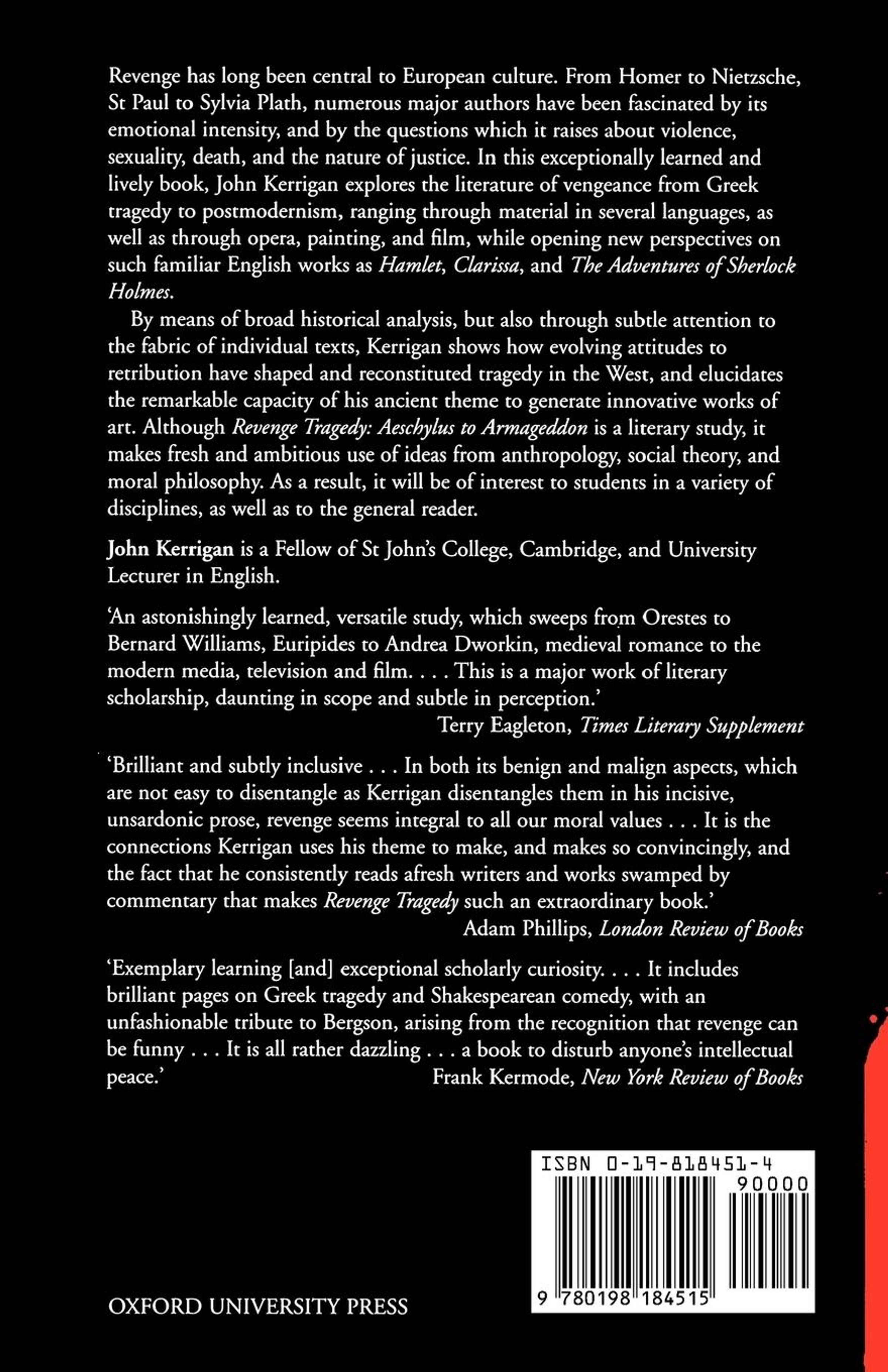 Revenge has long been a central theme in Western culture. From Homer to Nietzsche, from St. Paul to Sylvia Plath, major writers have been fascinated by its emotional intensity and by the questions it raises about the nature of justice, violence, sexuality, and death. John Kerrigan employs both wide-ranging historical analysis and subtle attention to individual texts to explore the culture of vengeance in several languages and genres. Thus, he shows how evolving attitudes to retribution have shaped and reconstituted tragedy in the West and elucidates the remarkable capacity of this ancient theme to generate innovative works of art. Although this book is a literary study, it makes use of anthropology, social theory, and moral philosophy. As a result, it will be of interest to students in a variety of disciplines, as well as to the general reader.