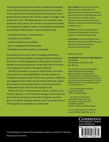 Intended for those with a limited background in genetic studies, this concise, entry-level text in conservation genetics is presented in a user-friendly format, with main points clearly highlighted. Solved problems are provided throughout to help illustrate key equations, although a basic knowledge of Mendelian genetics and simple statistics is assumed. A glossary and suggestions for further reading provide additional support for the reader. Numerous pen-and-ink portraits of endangered species bring the material to life. Also available: Introduction to Conservation Genetics ..."balance[s] student need for clarity and brevity with the requirements of conservation professionals for detailed applications." Choice 0-521-63014-2 Hardback $130.00 C 0-521-63985-9 Paperback $50.00 D