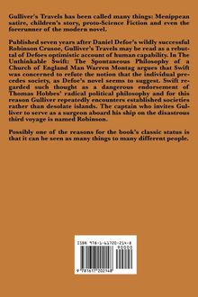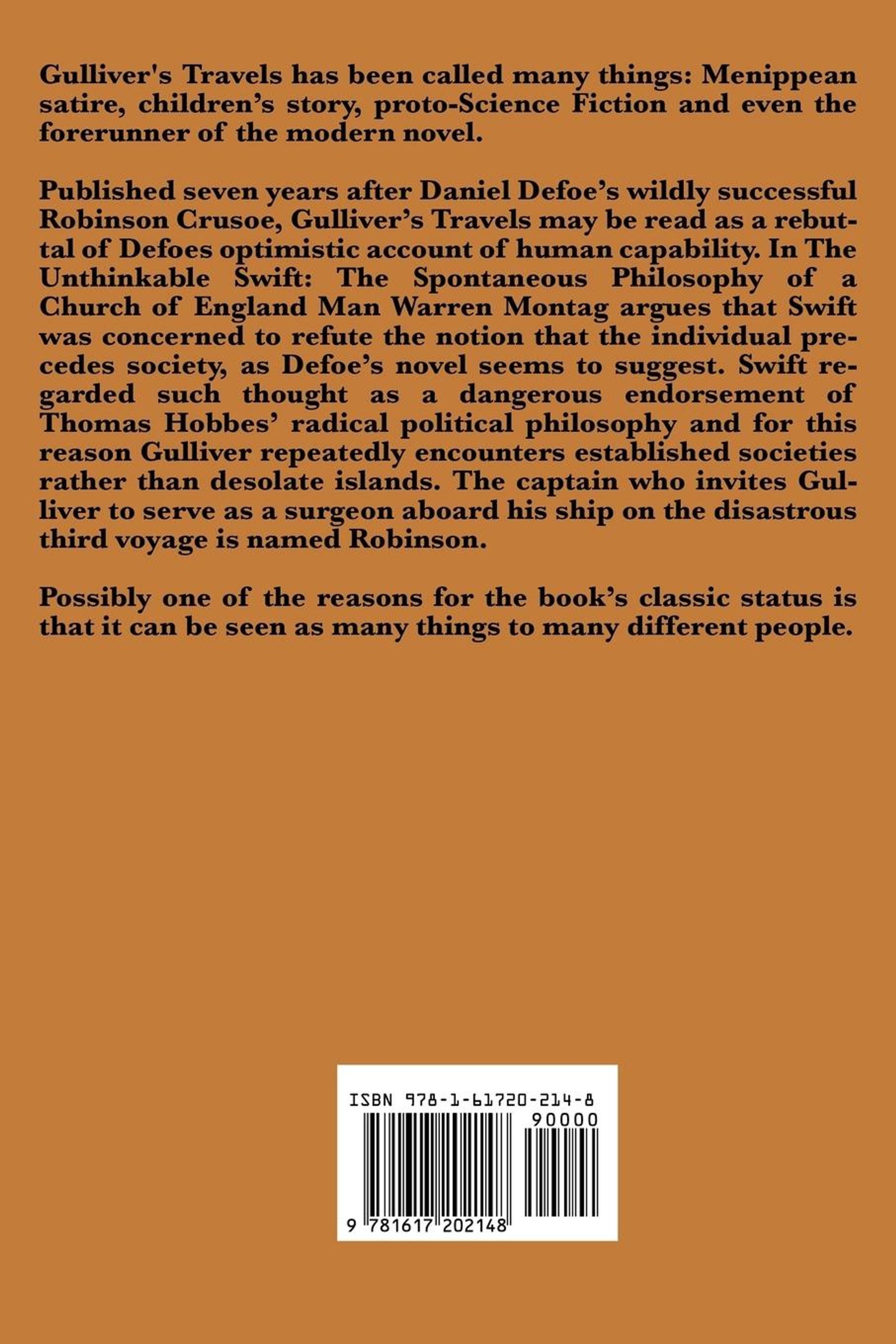 Published seven years after Daniel Defoe's wildly successful Robinson Crusoe, Gulliver's Travels may be read as a rebuttal of Defoes optimistic account of human capability. In The Unthinkable Swift: The Spontaneous Philosophy of a Church of England Man Warren Montag argues that Swift was concerned to refute the notion that the individual precedes society, as Defoe's novel seems to suggest. Swift regarded such thought as a dangerous endorsement of Thomas Hobbes' radical political philosophy and for this reason Gulliver repeatedly encounters established societies rather than desolate islands. The captain who invites Gulliver to serve as a surgeon aboard his ship on the disastrous third voyage is named Robinson.