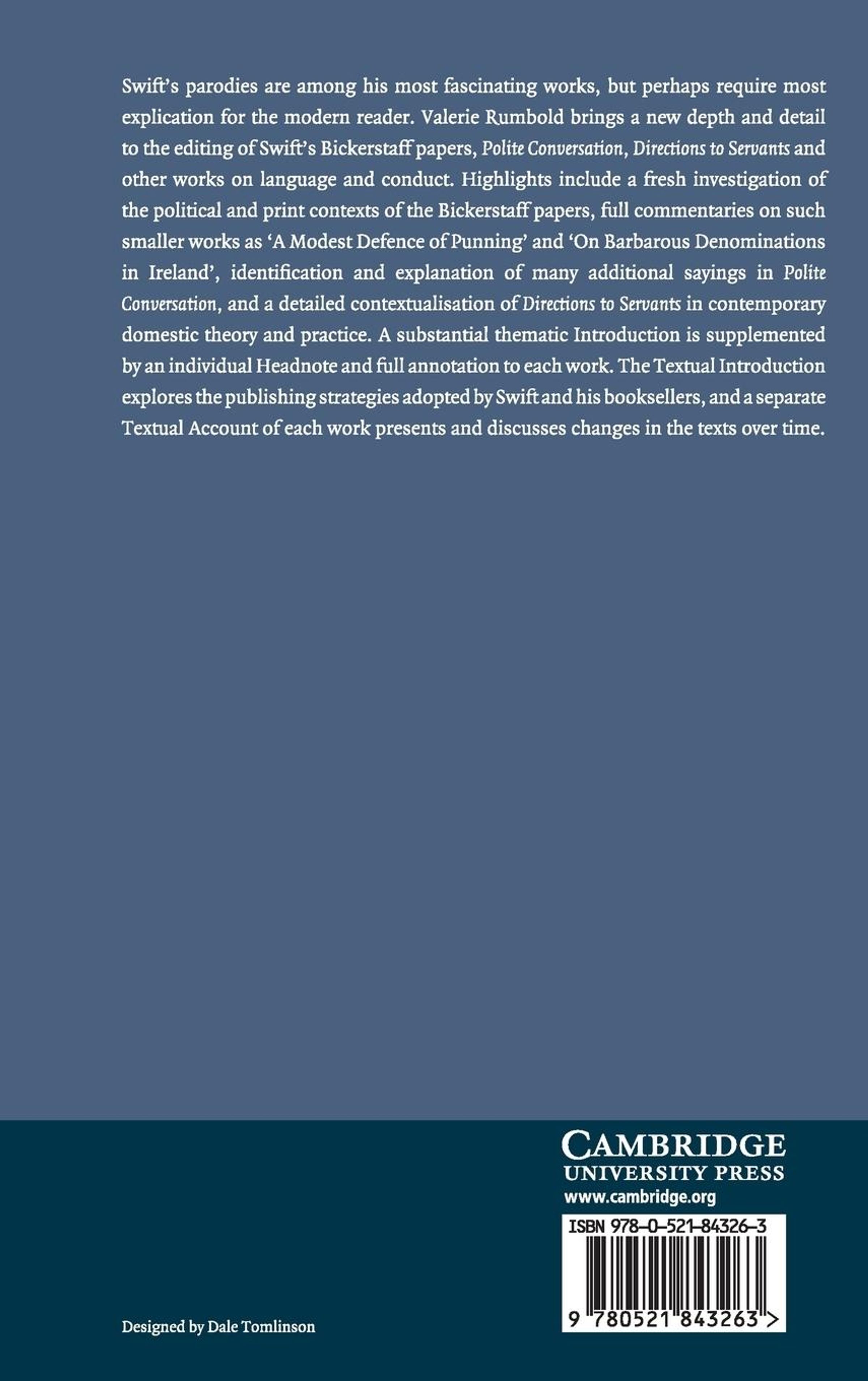 Swift's parodies are among his most fascinating works, but perhaps require most explication for the modern reader. Valerie Rumbold brings a new depth and detail to the editing of Swift's Bickerstaff papers, 'Polite Conversation', 'Directions to Servants' and other works on language and conduct. Highlights include a fresh investigation of the political and print contexts of the Bickerstaff papers, full commentaries on such smaller works as 'A Modest Defence of Punning' and 'On Barbarous Denominations in Ireland', identification and explanation of many additional sayings in 'Polite Conversation', and a detailed contextualisation of 'Directions to Servants' in contemporary domestic theory and practice. A substantial thematic Introduction is supplemented by an individual headnote and full annotation to each work. The Textual Introduction explores the publishing strategies adopted by Swift and his booksellers, and a separate Textual Account of each work presents and discusses changes in the texts over time.