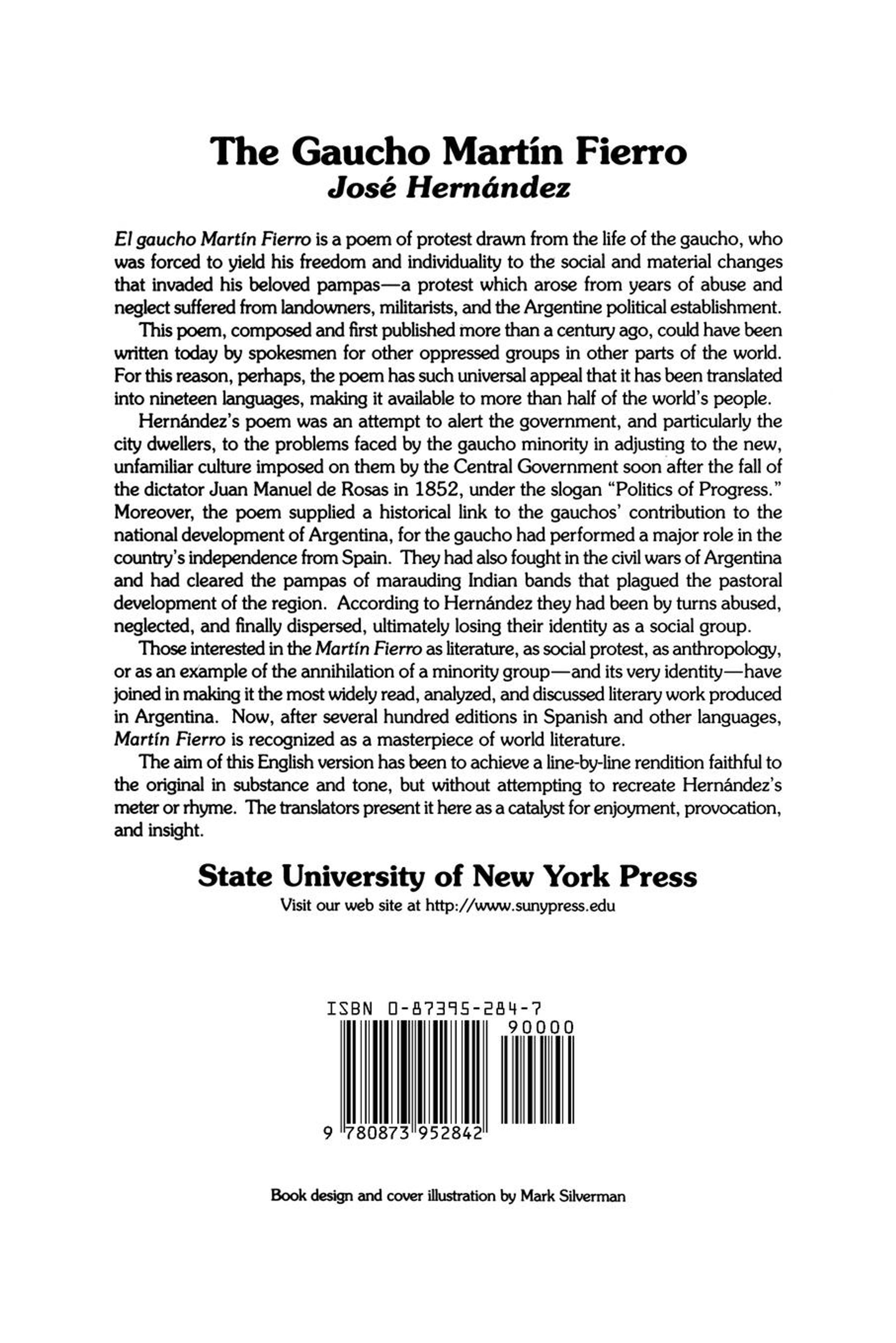This is a poem of protest drawn from the life of the gaucho, who was forced to yield his freedom and individuality to the social and material changes that invaded his beloved pampas-a protest which arose from years of abuse and neglect suffered from landowners, militarists, and the Argentine political establishment. This poem, composed and first published more than a century ago, could have been written today by spokesmen for other oppressed groups in other parts of the world. For this reason, perhaps, the poem has such universal appeal that it has been translated into nineteen languages, making it available to more than half of the world's people. Hernandez's poem was an attempt to alert the government, and particularly the city dwellers, to the problems faced by the gaucho minority in adjusting to the new, unfamiliar culture imposed on them by the Central Government soon after the fall of the dictator Juan Manuel de Rosas in 1852, under the slogan "Politics of Progress." Moreover, the poem supplied a historical link to the gauchos' contribution to the national development of Argentina, for the gaucho had performed a major role in the country's independence from Spain. They had also fought in the civil wars of Argentina and had cleared the pampas of marauding Indian bands that plagued the pastoral development of the region. According to Hernandes they had been by turns abused, neglected, and finally dispersed, ultimately losing their identity as a social group. Those interested in the Martín Fierro as literature, as social protest, as anthropology, or as an example of the annihilation of a minority group-and its very identity-have joined in making it the most widely read, analyzed, and discussed literary work produced in Argentina. Now, after several hundred editions in Spanish and other languages, Martín Fierro is recognized as a masterpiece of world literature. The aim of this English version has been to achieve a line-by-line rendition faithful to the original in substance and tone, but without attempting to recreate Hernandez's meter or rhyme. The translators present it here as a catalyst for enjoyment, provocation, and insight.