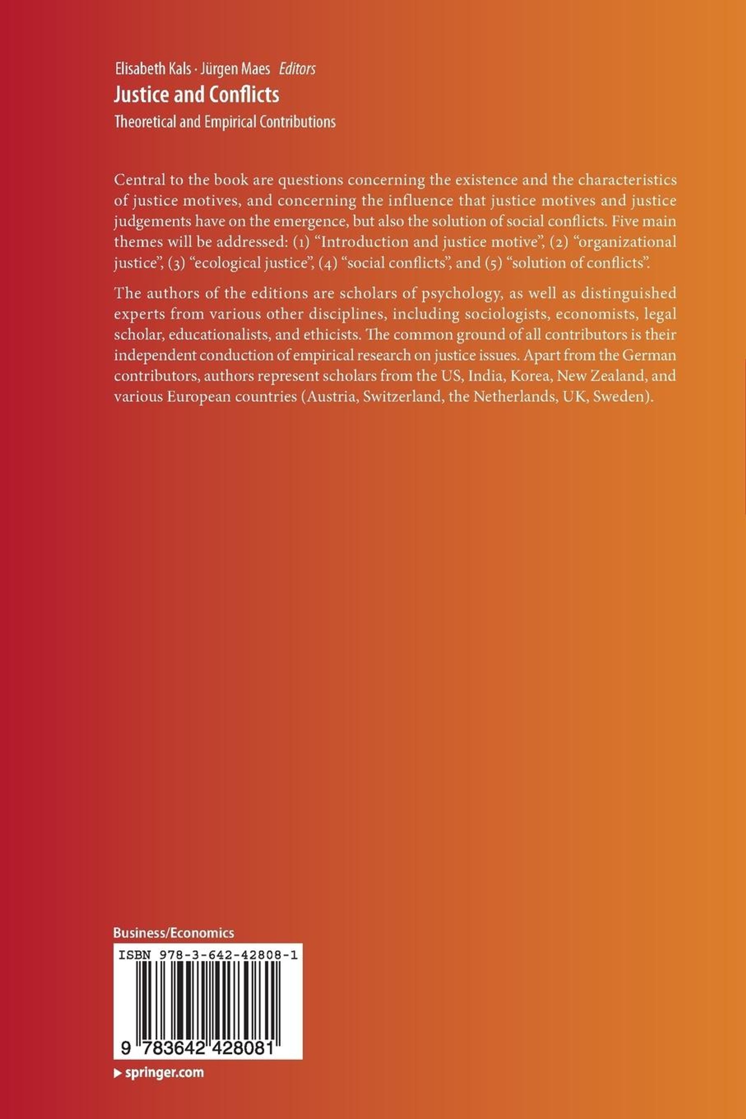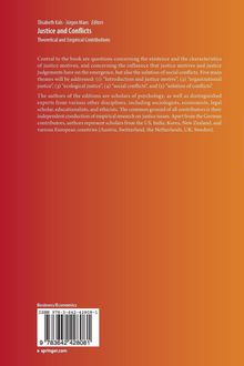 Central to the book are questions concerning the existence and the characteristics of justice motives, and concerning the influence that justice motives and justice judgements have on the emergence, but also the solution of social conflicts. Five main themes will be addressed: (1) Introduction and justice motive, (2) organizational justice, (3) ecological justice, (4) social conflicts, and (5) solution of conflicts. The authors of the editions are scholars of psychology, as well as distinguished experts from various other disciplines, including sociologists, economists, legal scholar, educationalists, and ethicists. The common ground of all contributors is their independent conduction of empirical research on justice issues. Apart from the German contributors, authors represent scholars from the US, India, Korea, New Zealand, and various European countries (Austria, Switzerland, the Netherlands, UK, Sweden).