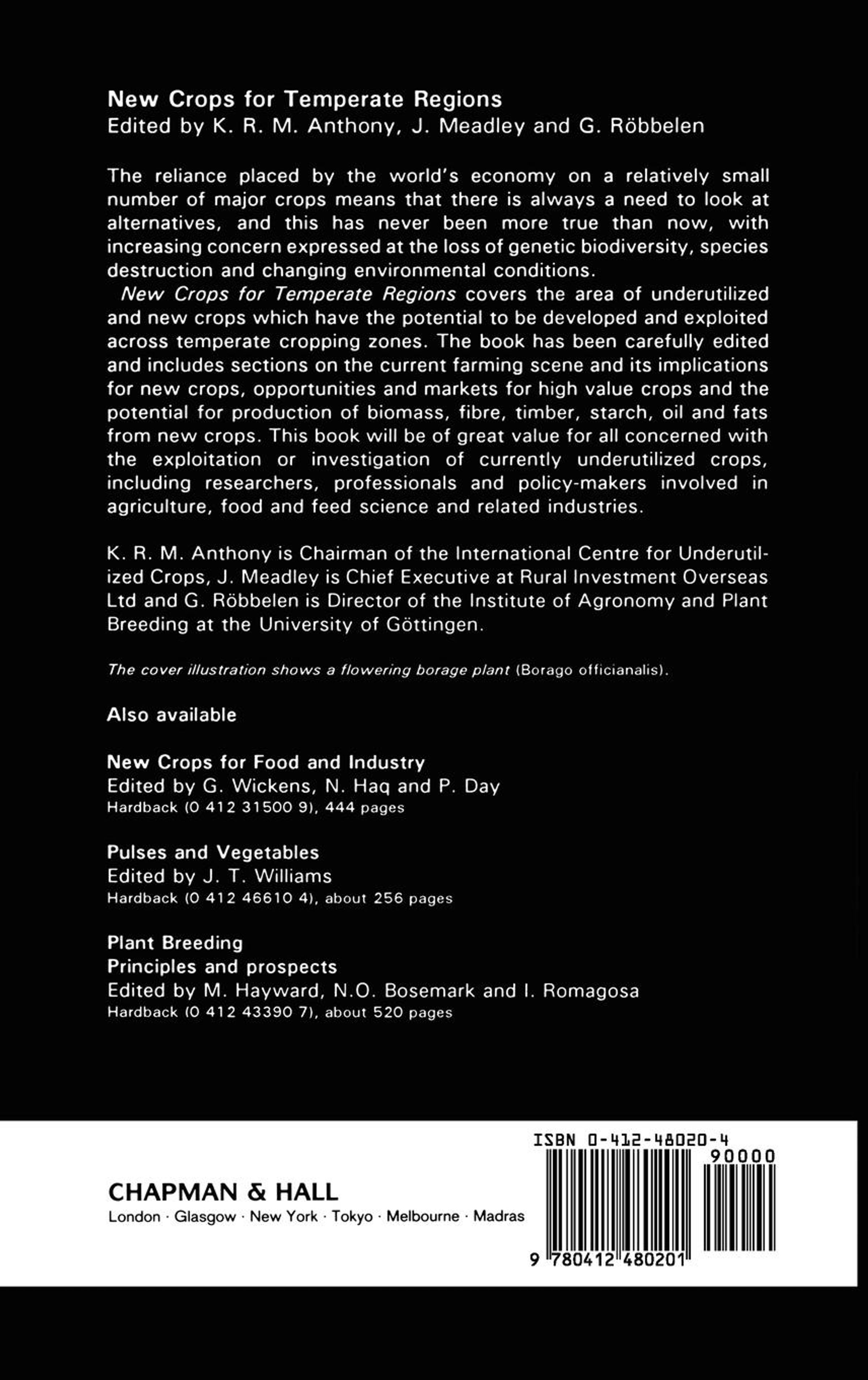 This book covers underutilized and new crops which have the potential to be developed and exploited across temperate cropping zones. Contents include details of opportunities and markets for high value crops and the use of new crops for production of biomass, fibre, timber, starch, oils and fats. It will be of great use to researchers and policy makers involved in agriculture, food and feed science.