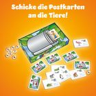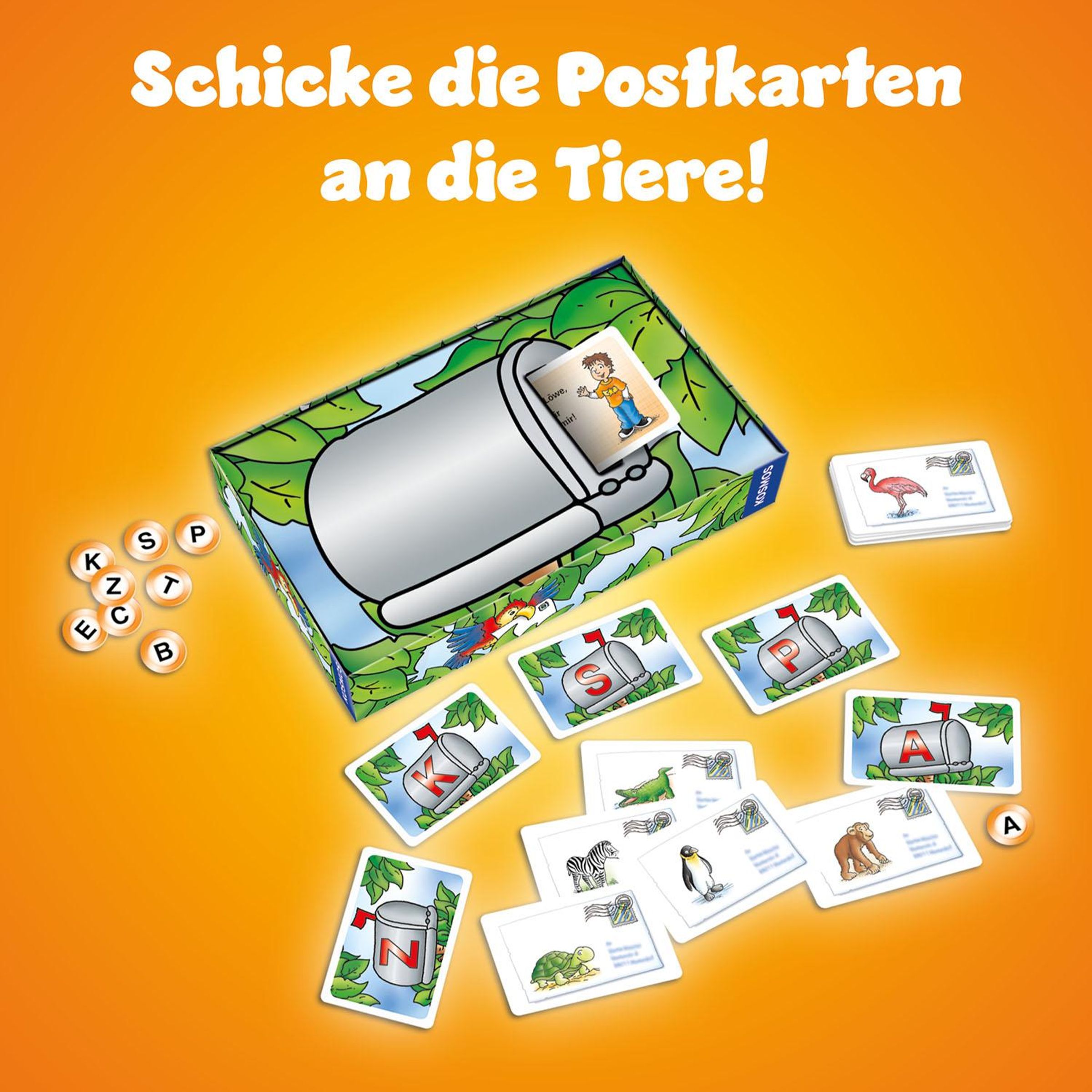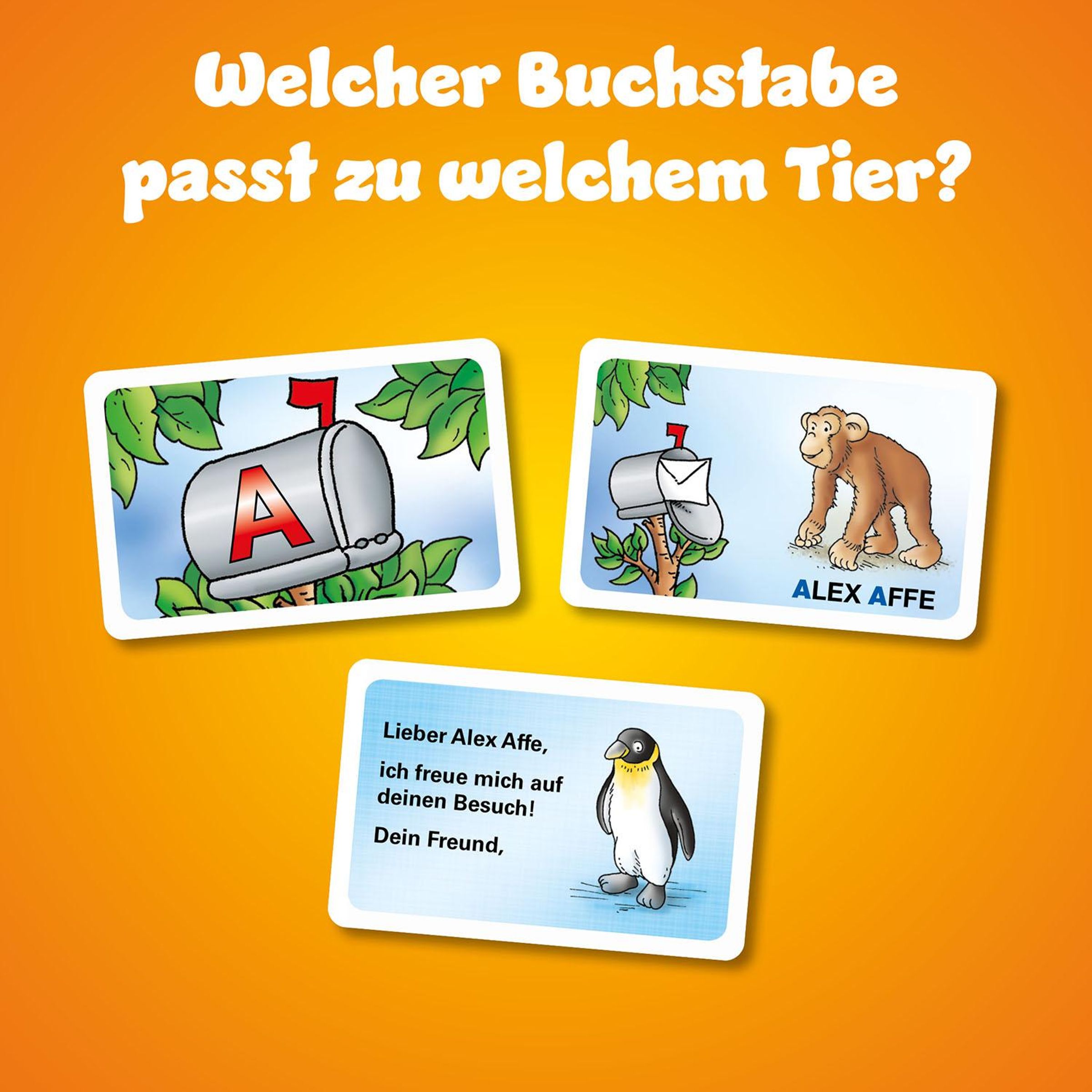 Juhu, da freut sich Alex Affe, denn sein Freund Paul Pinguin hat ihm geschrieben! Hilf mit und verteil die Postkarten an die Tiere. Jede Abc-Karte zeigt den Anfangsbuchstaben eines Tieres. Drehst du die Karte um, siehst du, ob du die Postkarte dem richtigen Tier gebracht hast!