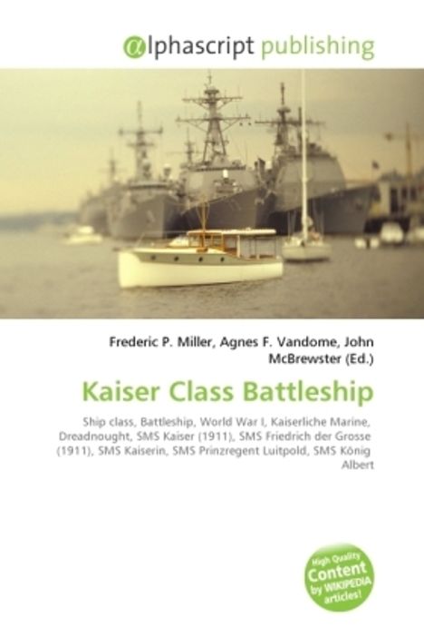 Please note that the content of this book primarily consists of articles available from Wikipedia or other free sources online. The Kaiser class was a class of five battleships that were built in Germany prior to World War I and served in the German Imperial Navy during the war. They were the third class of German dreadnoughts, and the first to feature turbine engines and superfiring turrets. The five ships were Kaiser, Friedrich der Grosse, Kaiserin, Prinzregent Luitpold, and König Albert. As was usual for German battleships of the period, the Kaiser class mounted main guns that were smaller than those of their British rivals: 30.5 cm (12.0 in), compared to the 34.3 cm (13.5 in) guns of the British Orion-class battleship. All five ships saw action in the North Sea during the war; they served together as the VI Division of the III Battle Squadron. Four were present during the Battle of Jutland; König Albert was in dock at the time