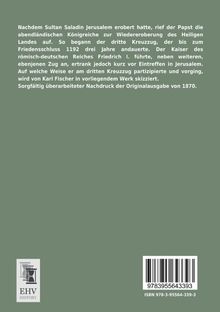 Nachdem Sultan Saladin Jerusalem erobert hatte, rief der Papst die abendländischen Königreiche zur Wiedereroberung des Heiligen Landes auf. So begann der dritte Kreuzzug, der bis zum Friedensschluss 1192 drei Jahre andauerte. Der Kaiser des römisch-deutschen Reiches Friedrich I. führte, neben weiteren, ebenjenen Zug an, ertrank jedoch kurz vor Eintreffen in Jerusalem. Auf welche Weise er am dritten Kreuzzug partizipierte und vorging, wird von Karl Fischer in vorliegendem Werk skizziert. Sorgfältig überarbeiteter Nachdruck der Originalausgabe von 1870.