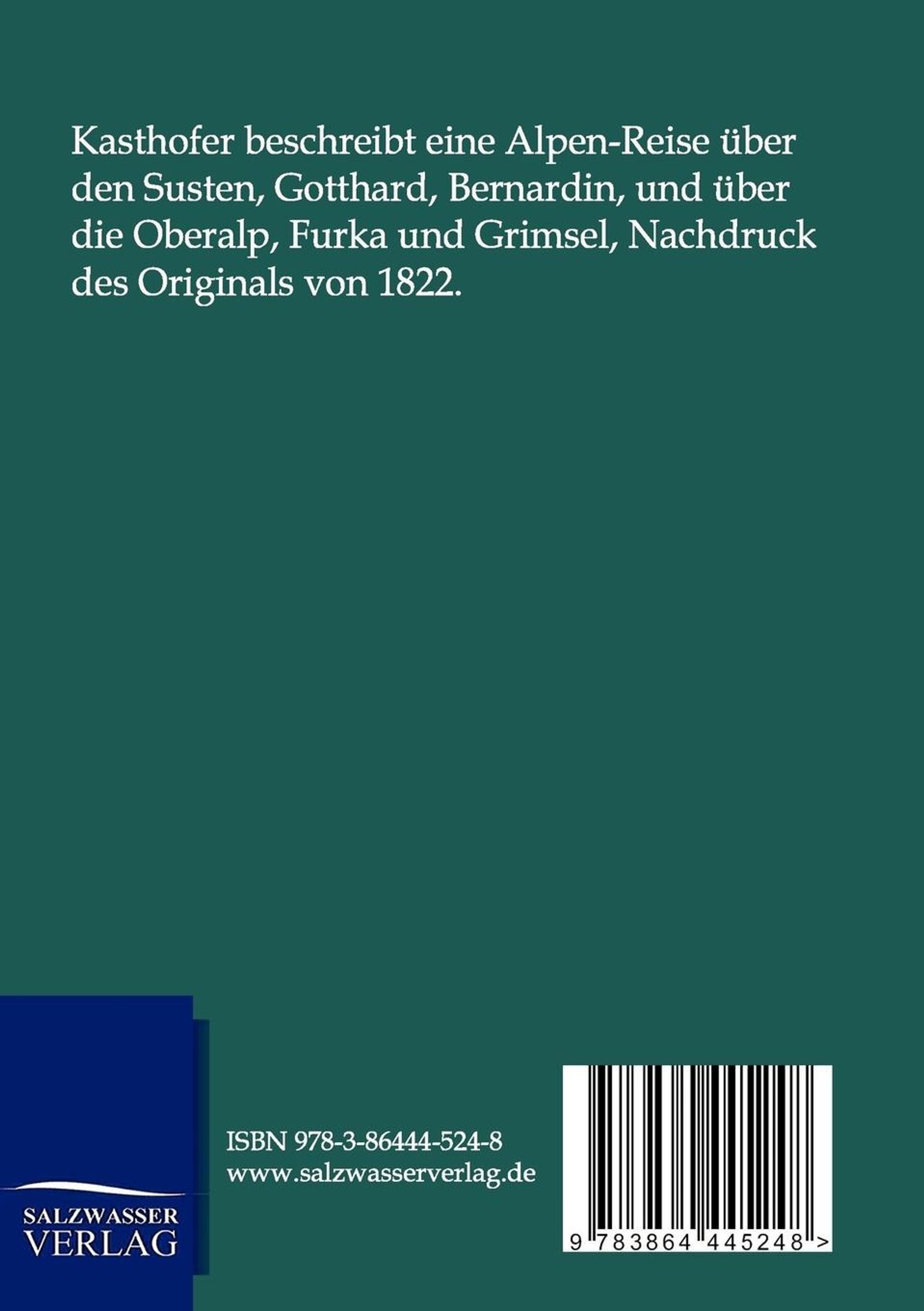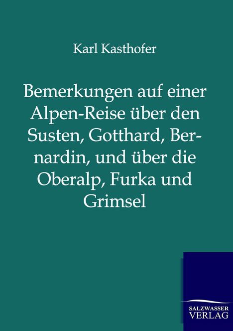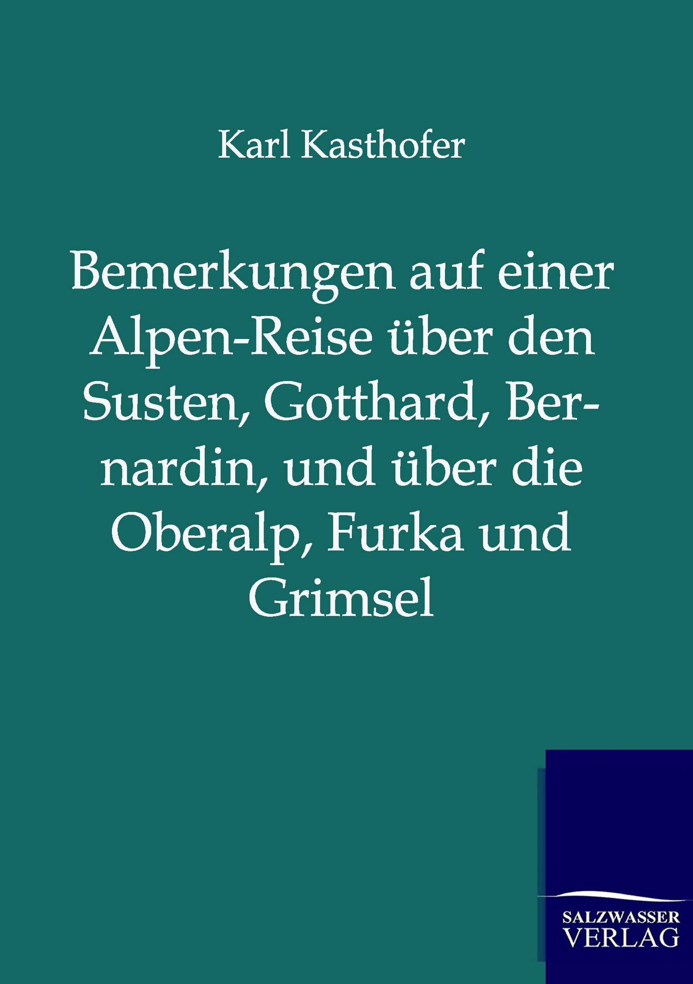 Kasthofer beschreibt eine Alpen-Reise über den Susten, Gotthard, Bernardin, und über die Oberalp, Furka und Grimsel, Nachdruck des Originals von 1822.