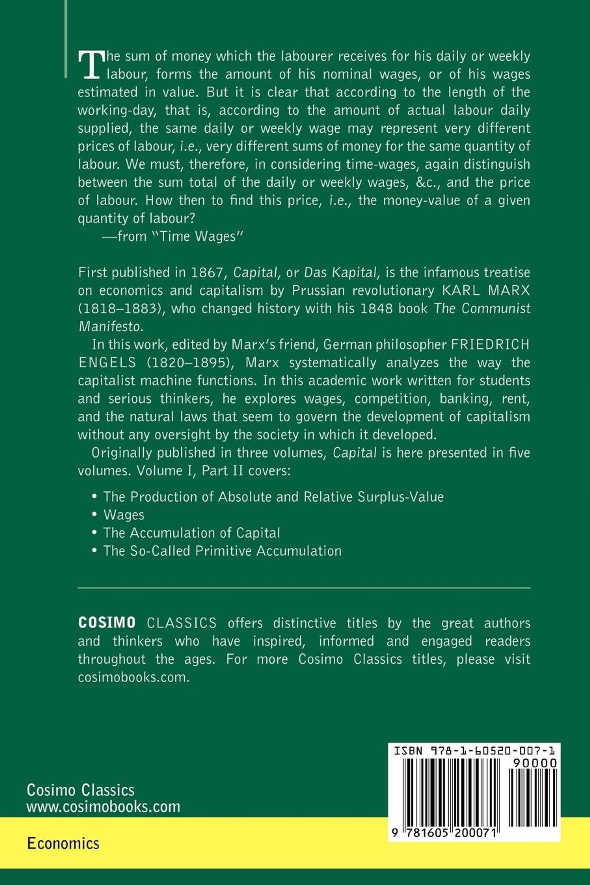 In this work, edited by Marx's friend, German philosopher FRIEDRICH ENGELS (1820-1895), Marx systematically analyzes the way the capitalist machine functions. In this academic work written for students and serious thinkers, he explores wages, competition, banking, rent, and the natural laws that seem to govern the development of capitalism without any oversight by the society in which it developed.
