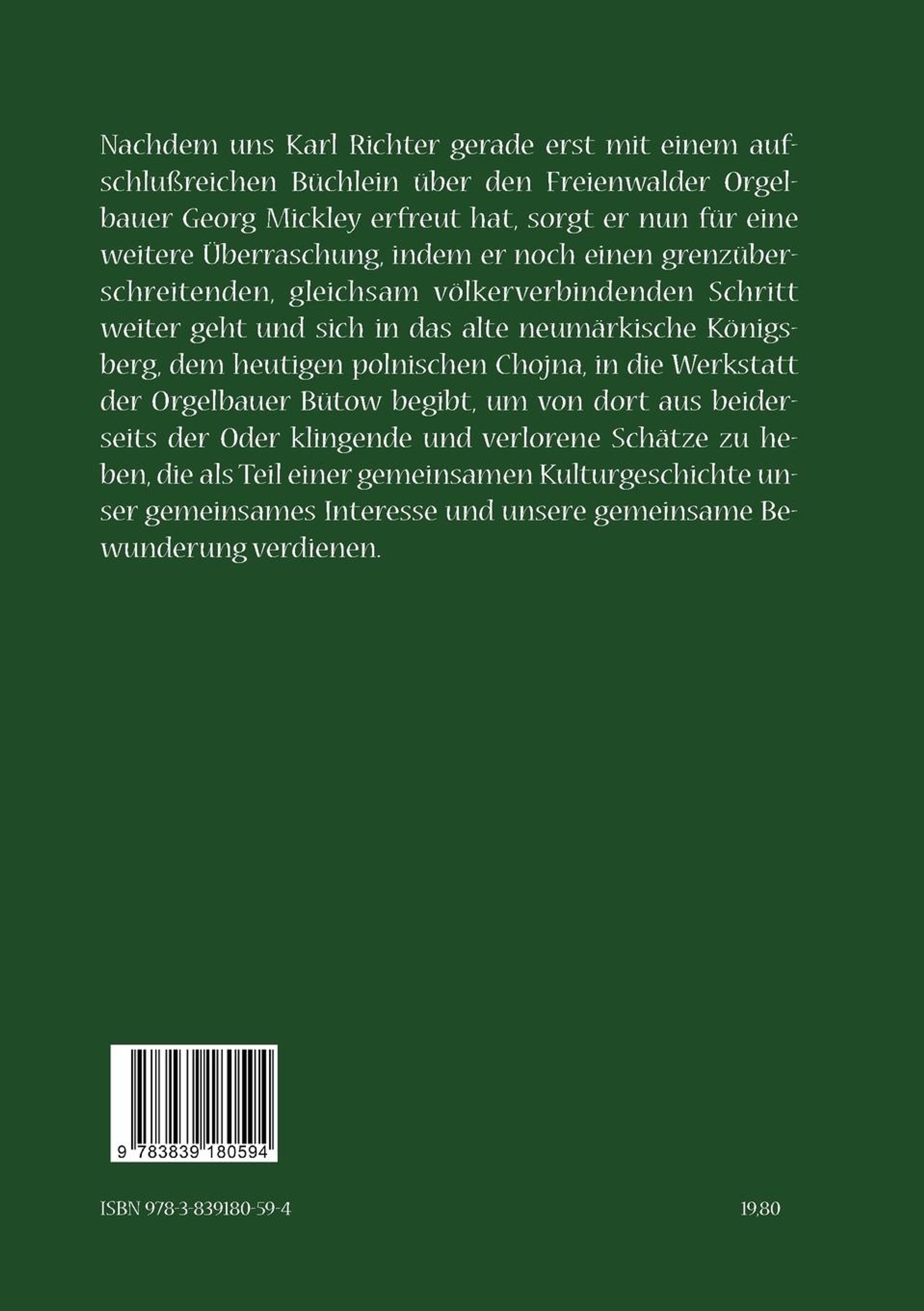 Nachdem uns Karl Richter mit einem aufschlußreichen Büchlein über den Freienwalder Orgelbauer Georg Mickley erfreut hat, sorgt er hier für eine weitere Überraschung, indem er noch einen grenzüberschreitenden, gleichsam völkerverbindenden Schritt weiter geht und sich in das alte neumärkische Königsberg, dem heutigen polnischen Chojna, in die Werkstatt der Orgelbauer Bütow begibt, um von dort aus beiderseits der Oder klingende und verlorene Schätze zu heben, die als Teil einer gemeinsamen Kulturgeschichte unser gemeinsames Interesse und unsere gemeinsame Bewunderung verdienen.