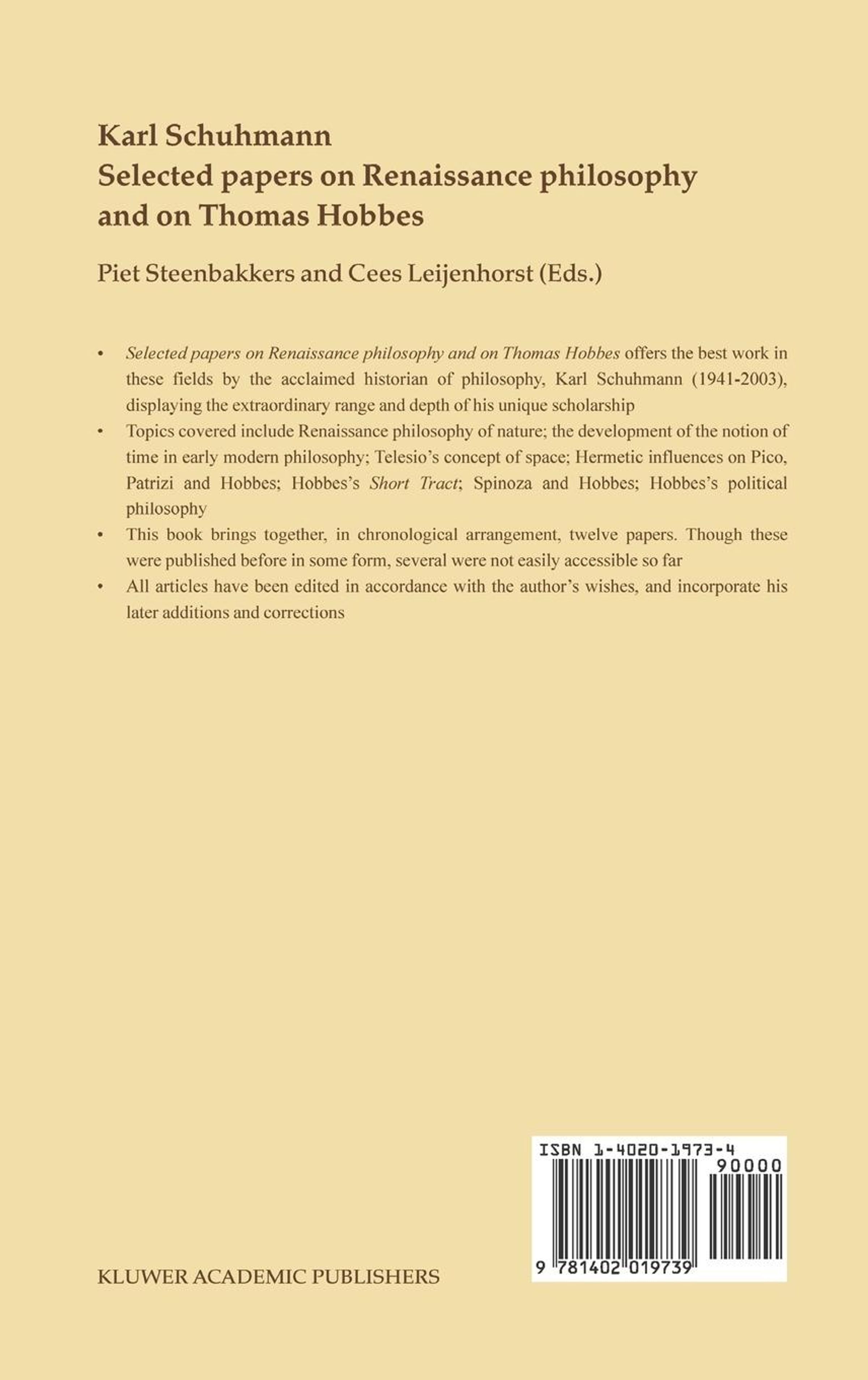 -Selected papers on Renaissance philosophy and on Thomas Hobbes offers the best work in these fields by the acclaimed historian of philosophy, Karl Schuhmann (1941-2003), displaying the extraordinary range and depth of his unique scholarship, -Topics covered include Renaissance philosophy of nature; the development of the notion of time in early modern philosophy; Telesio's concept of space; Hermetic influences on Pico, Patrizi and Hobbes; Hobbes's Short Tract*;* Spinoza and Hobbes; Hobbes's political philosophy, -This book brings together, in chronological arrangement, twelve papers. Though these were published before in some form, several were not easily accessible so far, -All articles have been edited in accordance with the author's wishes, and incorporate his later additions and corrections