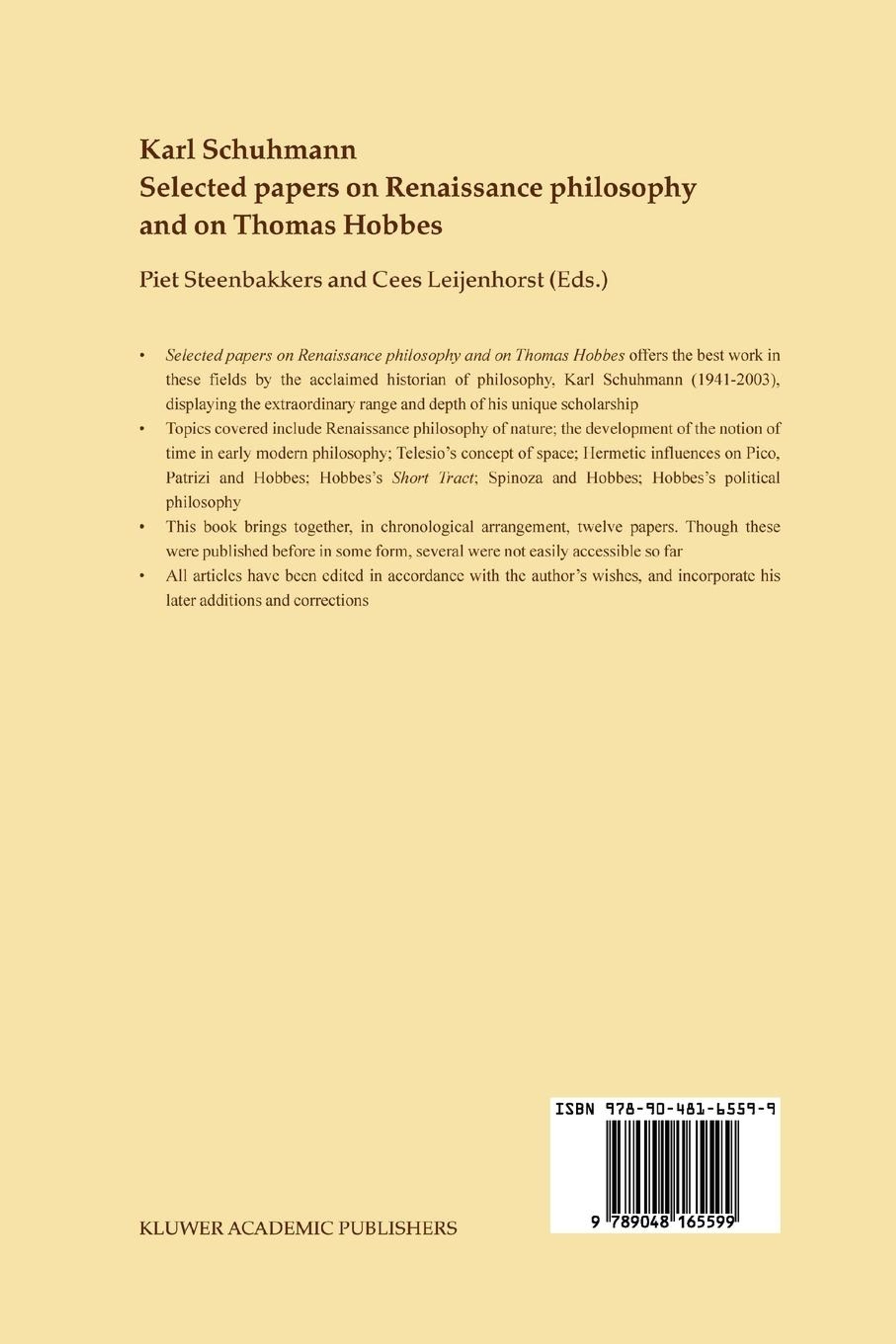 -Selected papers on Renaissance philosophy and on Thomas Hobbes offers the best work in these fields by the acclaimed historian of philosophy, Karl Schuhmann (1941-2003), displaying the extraordinary range and depth of his unique scholarship, -Topics covered include Renaissance philosophy of nature; the development of the notion of time in early modern philosophy; Telesio's concept of space; Hermetic influences on Pico, Patrizi and Hobbes; Hobbes's Short Tract*;* Spinoza and Hobbes; Hobbes's political philosophy, -This book brings together, in chronological arrangement, twelve papers. Though these were published before in some form, several were not easily accessible so far, -All articles have been edited in accordance with the author's wishes, and incorporate his later additions and corrections