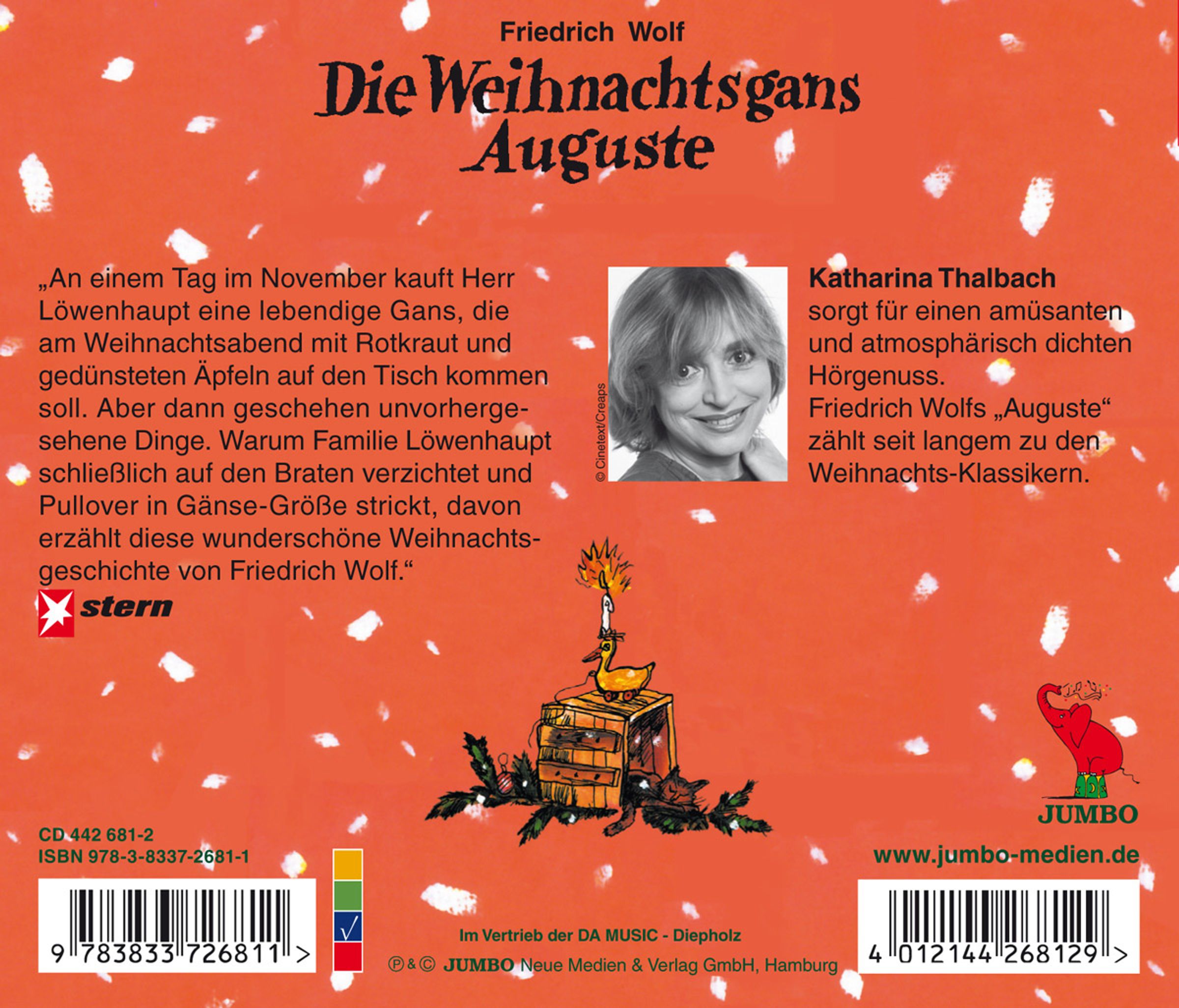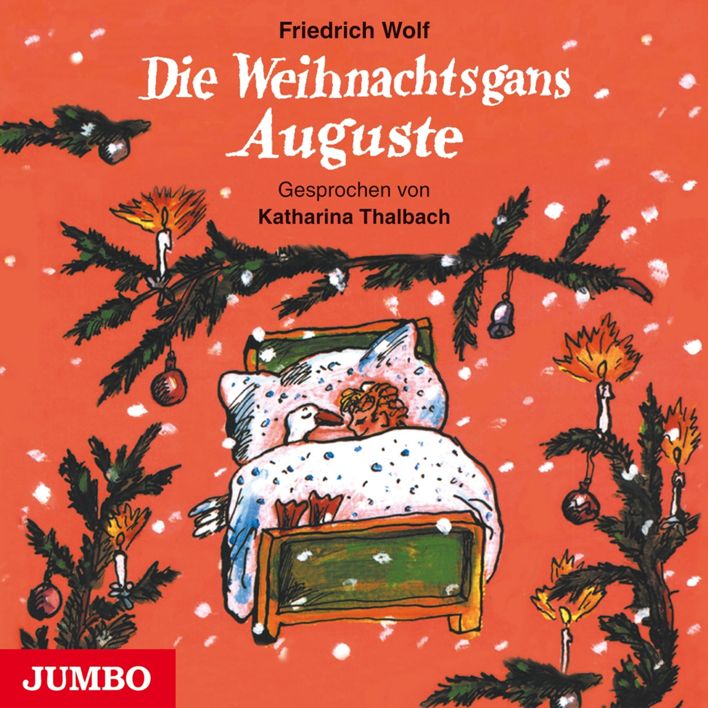 Herr Löwenhaupt kauft eine lebendige Gans, die am Weihnachtsabend mit Rotkraut und gedünsteten Äpfeln auf den Tisch kommen soll. Bis dahin soll sie in einer Kiste im Kartoffelkeller ihr Quartier haben. Die drei Kinder versorgen die Gans und taufen sie Auguste. Der kleine Peter besteht sogar darauf, dass Auguste im Kinderzimmer schlafen darf, und nimmt sie heimlich mit ins Bett. Als der Vater kurz vor Weihnachten Auguste in den Gänsehimmel schicken will, schreit nicht nur die Gans Zeter und Mordio. Friedrich Wolfs "Die Weihnachtsgans Auguste" zählt seit langem zu den Weihnachts-Klassikern. Katharina Thalbach sorgt für einen amüsanten und atmosphärisch dichten Hörgenuss. Das gleichnamige Buch ist im Kinderbuch Verlag erschienen.