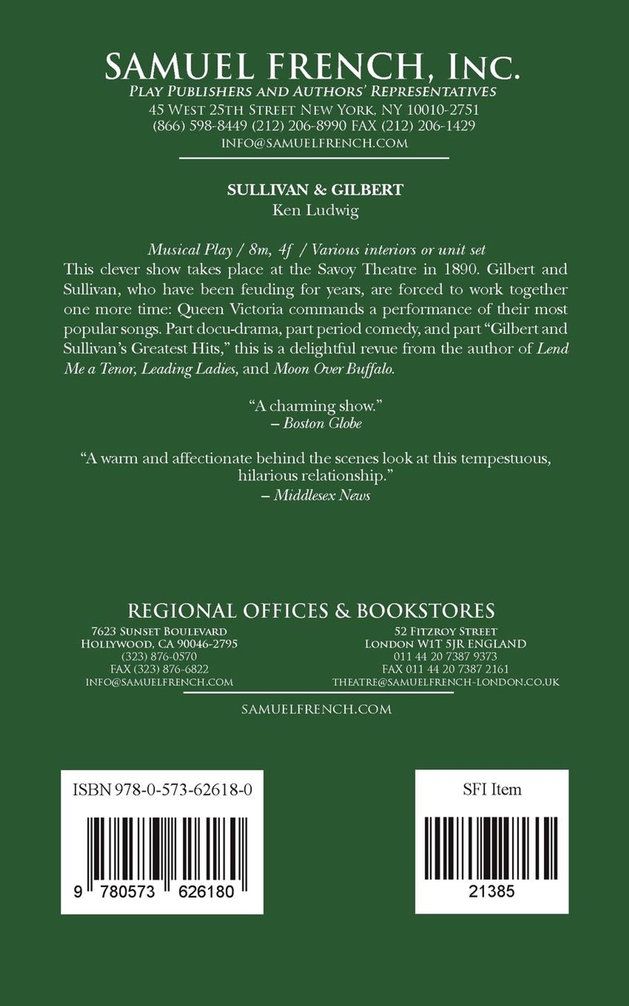Ken Ludwig. Music by Sir Arthur Sullivan. Lyrics by William S. Gilbert. Characters: 8 male, 4 female Various interior scenes, or one unit set. This clever show takes place at the Savoy Theatre in 1890. Gilbert and Sullivan, who have been feuding for years, are forced to work together one more time: Queen Victoria commands a performance of their most popular songs. Part docu drama, part period comedy, and part "Gilbertt and Sullivan's Greatest Hits," this is a delightful r