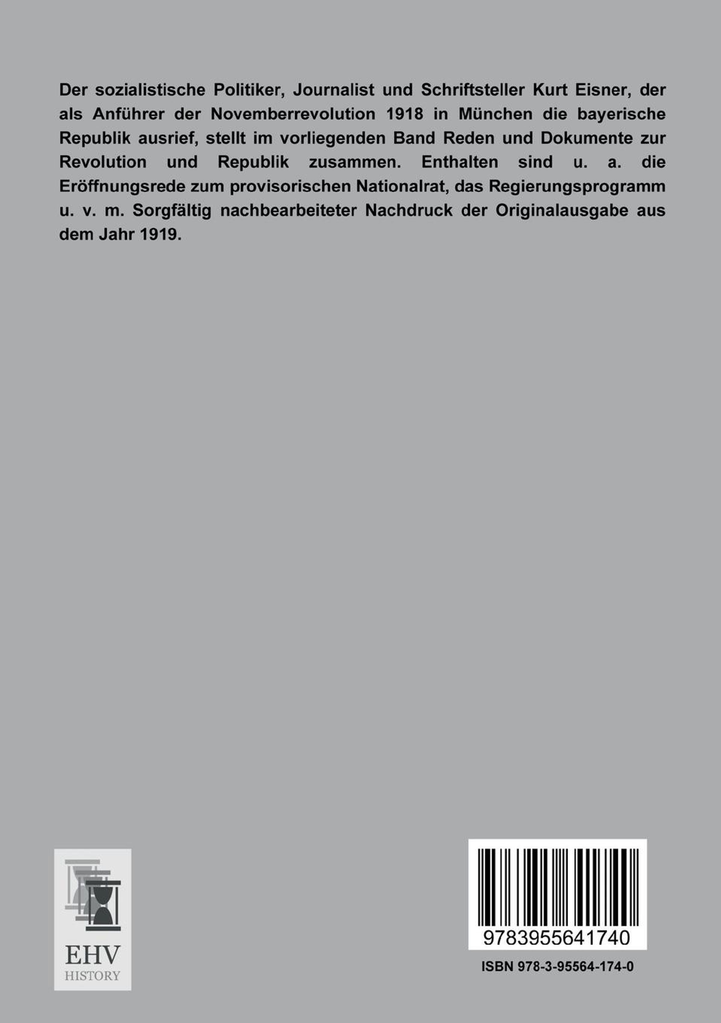 Der sozialistische Politiker, Journalist und Schriftsteller Kurt Eisner, der als Anführer der Novemberrevolution 1918 in München die bayerische Republik ausrief, stellt im vorliegenden Band Reden und Dokumente zur Revolution und Republik zusammen. Enthalten sind u. a. die Eröffnungsrede zum provisorischen Nationalrat, das Regierungsprogramm u. v. m. Sorgfältig nachbearbeiteter Nachdruck der Originalausgabe aus dem Jahr 1919.