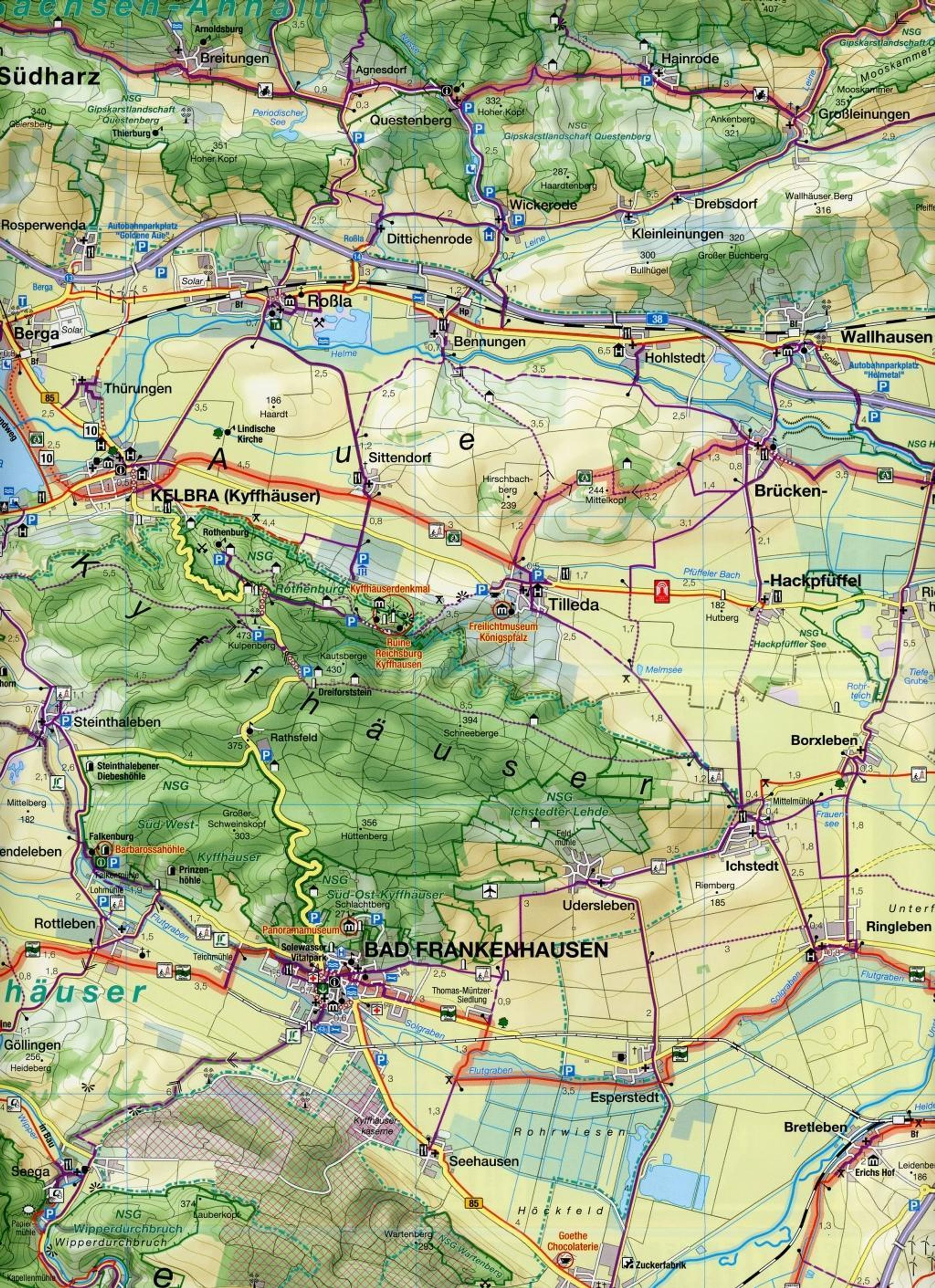 Die Fahrradkarte stellt eine der geschichtsträchtigsten Regionen in der Mitte Deutschlands dar - Bad Frankenhausen und die Bauernschlacht, der Kyffhäuser und Rotbart Kaiser Barbarossa, Lutherstadt Eisleben und der große Reformator, Nebra mit der berühmten Himmelsscheibe, Nordhausen mit seiner langen Tradition der Weinbrennerei oder Weißensee mit dem ältesten deutschen Reinheitsgebot des Bieres stehen dafür. Südharz, Kyffhäusergebirge, Hainleite, Schmücke, Hohe Schrecke, das Thüringer Becken sowie die Flusstäler von Unstrut und Helme offerieren eine große landschaftliche Vielfalt. Neben der herausragenden Landschaft mit der einzigartigen Flora und Fauna bietet die Region viel Wissens- und Erlebenswertes aus Kultur und Geschichte. Die Karte wurde nach geographischen, landschaftlichen und touristischen Aspekten erarbeitet. So reicht der Blattschnitt von Niedersachswerfen und Klostermansfeld im Norden bis nach Bad Tennstedt, Sömmerda und Rastenberg im Süden. Westlich reicht sie von Großengottern und Sollstedt sowie im Osten bis Lutherstadt Eisleben und Nebra. Reich an Sehenswürdigkeiten sind außerdem die Orte Artern, Bad Frankenhausen, Bleicherode, Greußen, Heldrungen, Kelbra, Kölleda, Memleben, Nebra, Nordhausen, Roßla, Roßleben, Rottleberode, Sangerhausen, Schlotheim, Sondershausen, Tilleda und Weißensee . Schön ist, dass die Besucher die Vielfalt der Region sehr gut per Rad erkunden können.