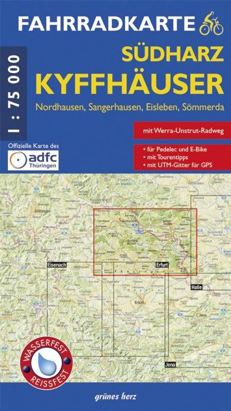 - Mit Nordhausen, Sangerhausen, Eisleben, Sömmerda und Kyffhäuser-Radweg. Offizielle Karte des ADFC-Landesverbandes Thüringen. Mit UTM-Gitter für GPS. Maßstab 1:75.000. Wasser- und reißfest.