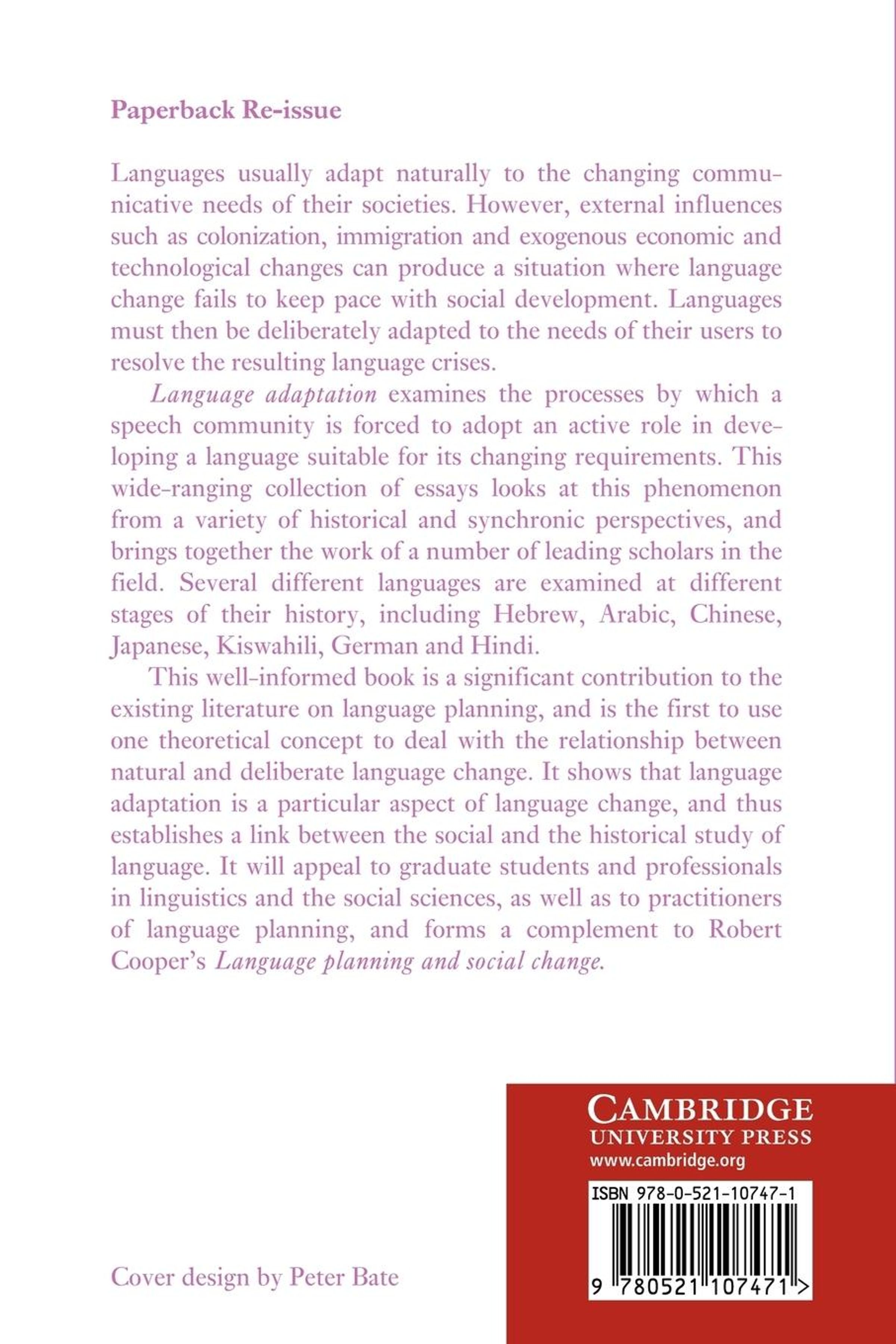 Language Adaptation examines the process by which a speech community is forced to adopt an active role in making its language suitable for changing functional requirements.