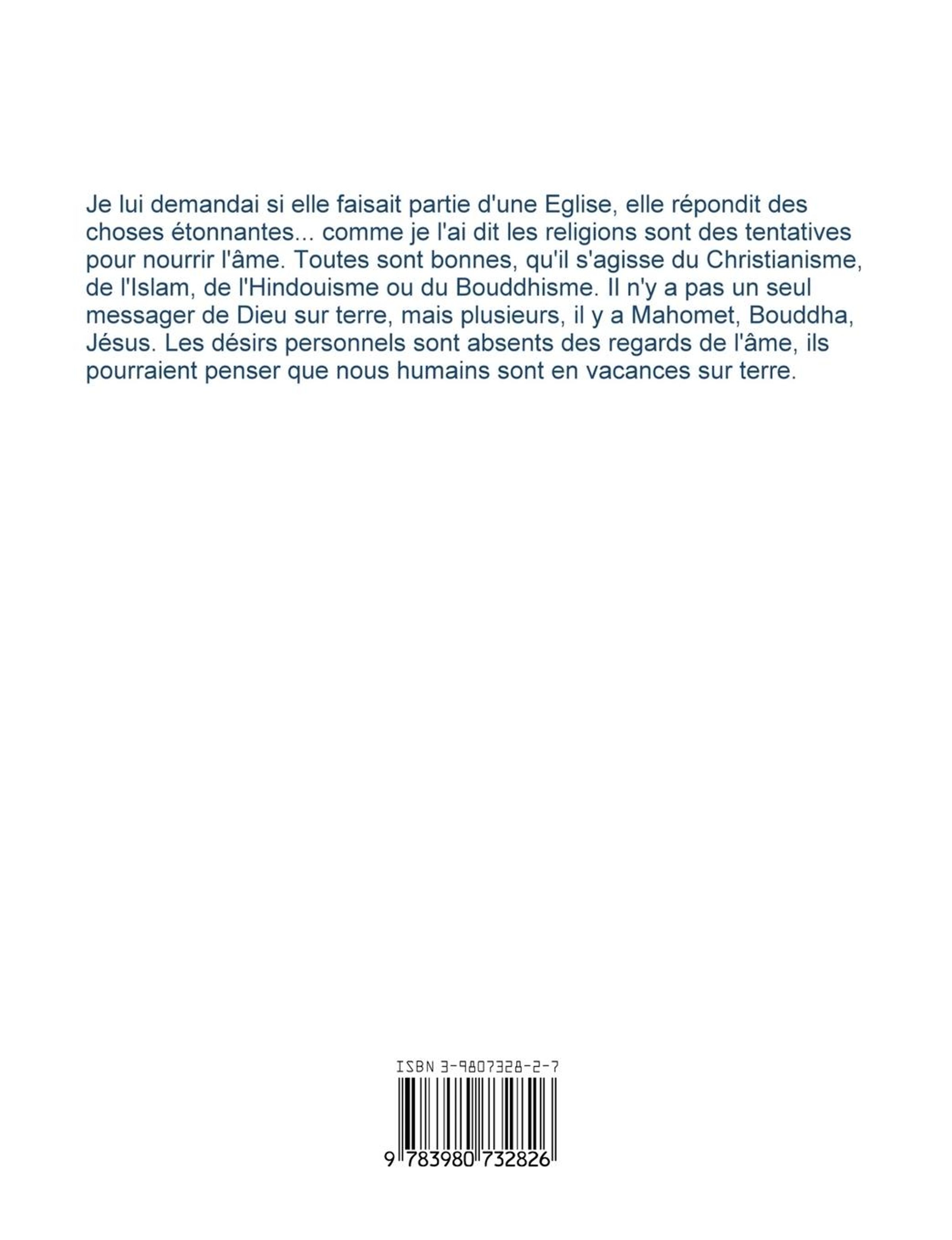 Je lui demandai si elle faisait partie d'une Eglise, elle répondit des choses étonnantes... comme je l'ai dit les religions sont des tentatives pour nourrir l'ame. Toutes sont bonnes, qu'il s'agisse du Christianisme, de l'Islam, de l'Hindouisme ou du Bouddhisme. Il n'y a pas un seul messager de Dieu sur terre, mais plusieurs, il y a Mahomet, Bouddha, Jésus. Les désirs personnels sont absents des regards de l'ame, ils pourraient penser que nous humains sont en vacances sur terre.