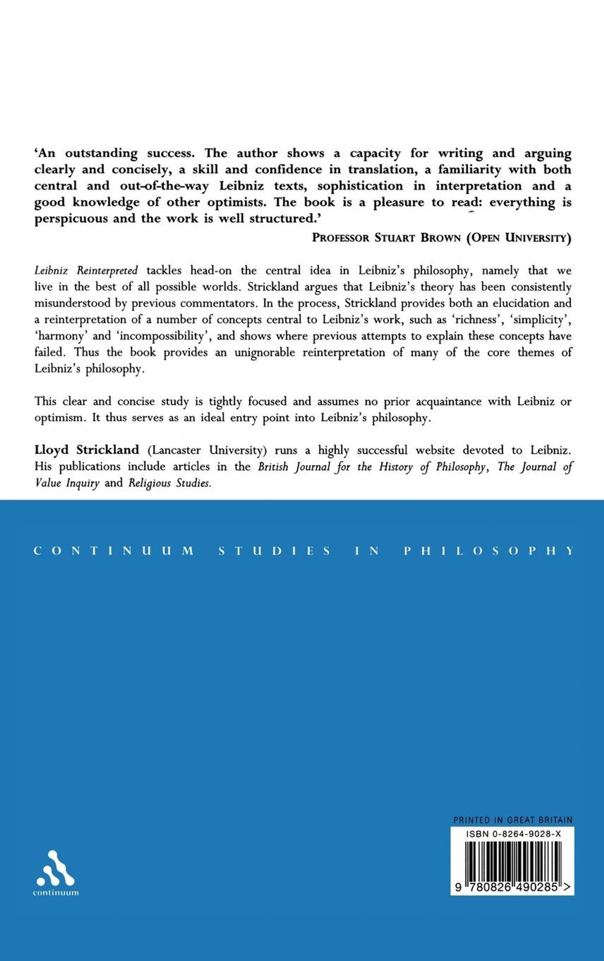 Leibniz Reinterpreted tackles head on the central idea in Leibniz's philosophy, namely that we live in the best of all possible worlds. Strickland argues that Leibniz's theory has been consistently misunderstood by previous commentators. In the process Strickland provides both an elucidation and reinterpretation of a number of concepts central to Leibniz's work, such as 'richness', 'simplicity', 'harmony' and 'incompossibility', and shows where previous attempts to explain these concepts have failed. This clear and concise study is tightly focussed and assumes no prior acquaintance with Leibniz or optimism. It thus serves as an ideal entry point into Leibniz's philosophy.