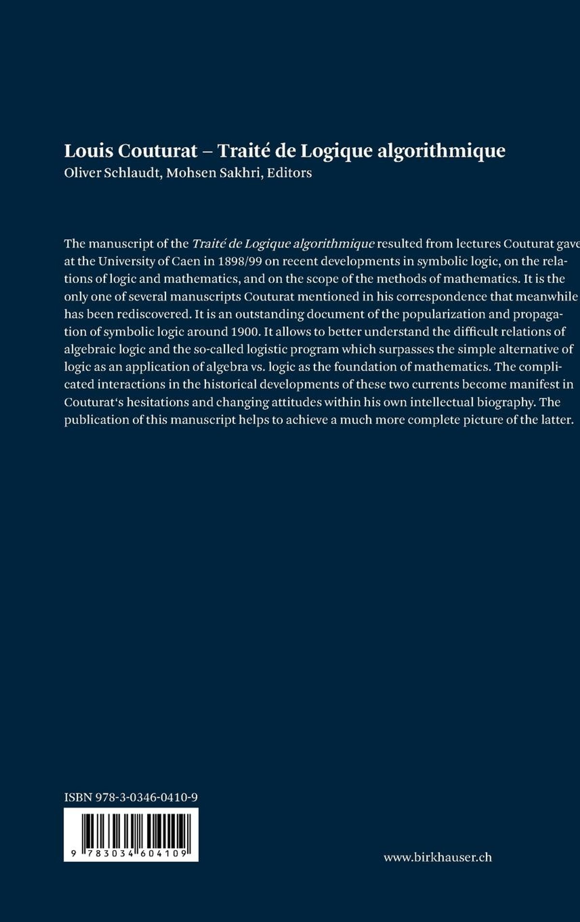 Louis Couturat (1868¿1914) was an outstanding intellectual of the turn of the nineteenth to the twentieth century. He is known for his work in the philosophy of mathematics, for his critical and editorial work on Leibniz, for his attempt to popularise modern logic in France, for his commitment to an international auxiliary language, as well as for his extended correspondence with scholars and mathematicians from Great Britain, the United States, Italy, and Germany. From his correspondence we know of four unpublished manuscripts on logic and its history, which were largely complete and some of which must have been of considerable size. We publish here for the ?rst time in a critical edition the only one of these manuscripts that has been rediscovered: the Traité de Logique algorithmique, presumably written in the years 1899¿1901. It is a highly interesting document of the academic reception and popularisation of symbolic logic in France. It provides evidence of the discussions and controversies which accompanied the creation of logic as a new branch of science. At the same time it completes the picture of Couturat¿s work, which has been opened up to systematic study by the publication of important parts of his correspondence during the last decade. We append the article on Symbolic Logic of 1902 which Couturat wrote in collaboration with Christine Ladd- Franklin for Baldwin¿s Dictionary of Philosophy and Psychology.