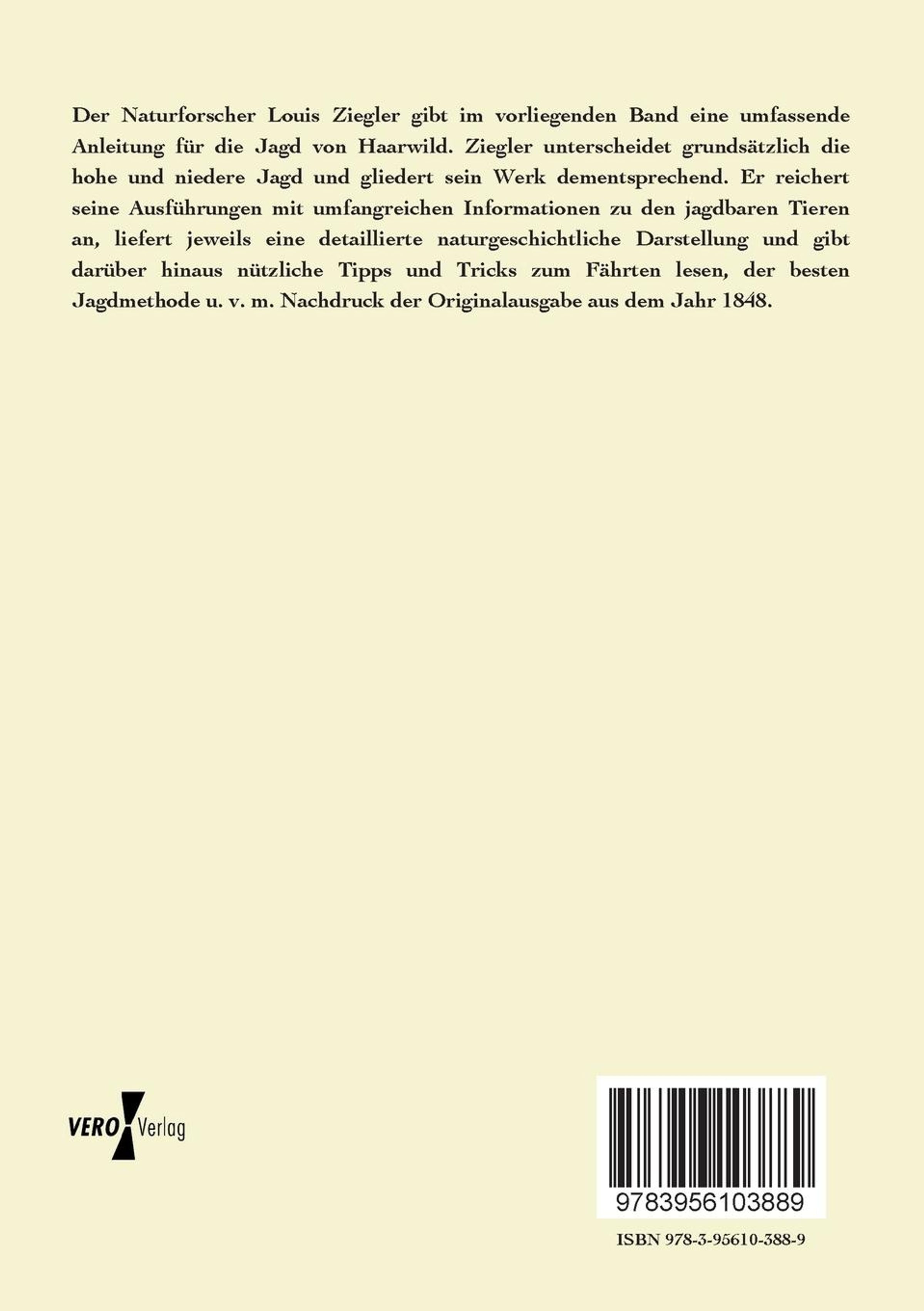 Der Naturforscher Louis Ziegler gibt im vorliegenden Band eine umfassende Anleitung für die Jagd von Haarwild. Ziegler unterscheidet grundsätzlich die hohe und niedere Jagd und gliedert sein Werk dementsprechend. Er reichert seine Ausführungen mit umfangreichen Informationen zu den jagdbaren Tieren an, liefert jeweils eine detaillierte naturgeschichtliche Darstellung und gibt darüber hinaus nützliche Tipps und Tricks zum Fährten lesen, der besten Jagdmethode u. v. m. Nachdruck der Originalausgabe aus dem Jahr 1848.