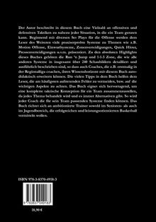 Der Autor beschreibt in diesem Buch eine Vielzahl an offensiven und defensiven Taktiken zu nahezu jeder Situation, in die ein Team geraten kann. Beginnend mit diversen Set Plays für die Offense werden dem Leser des Weiteren viele praxiserprobte Systeme zu Themen wie z. B. Motion Offense, Einwurfsysteme, Zonenverteidigungen, Quick Hitter, Pressenverteidigungen u. v.m. präsentiert. Zu den absoluten Highlights dieses Buches gehören die Run n Jump und 1-1-3 Zone, die wie alle anderen Systeme in insgesamt über 240 Schaubildern detailliert und ausführlich beschrieben sind, so dass auch Coaches, die z. B. erstmalig in der Regionalliga coachen, ihren Wissenshorizont mit diesem Buch auto- didaktisch erweitern können. Die vielen Tipps in dem Buch helfen dem Leser, die am häufigsten auftretenden Fehler zu vermeiden, bzw. auf die wichtigen Aspekte zu achten. Das Buch eignet sich hervorragend, um eine komplette taktische Konzeption für ein Team zusammenzustellen, da jedes Thema behandelt wird und es immer Alternativen gibt. So wird jeder Coach die für sein Team passenden Systeme finden können. Das Buch richtet sich an ambitionierte Trainer sowohl im Senioren- als auch im Jugendbereich, die erfolgreichen und leistungsorientierten Basketball vermitteln wollen.