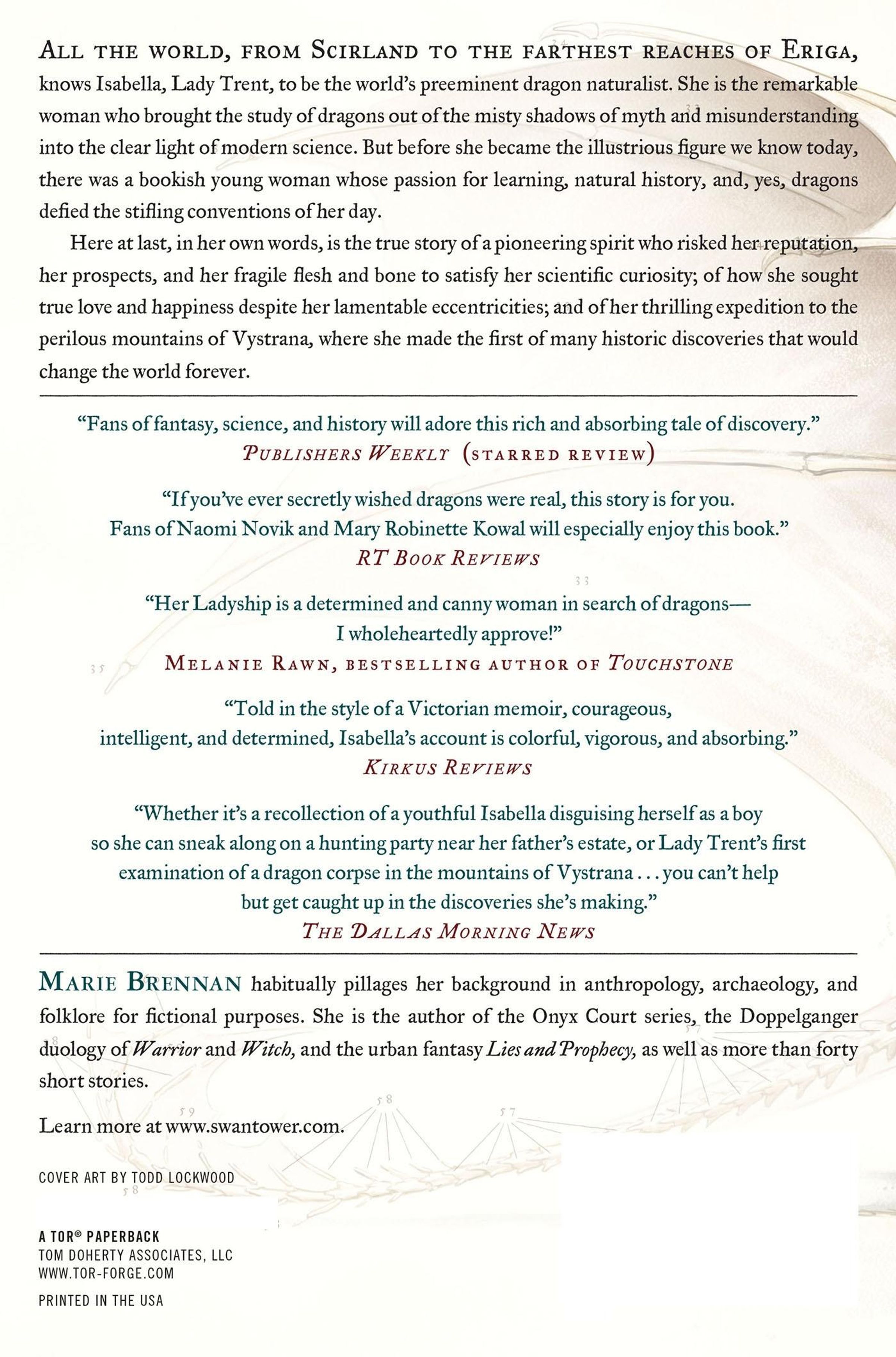 All the world, from Scirland to the farthest reaches of Eriga, know Isabella, Lady Trent, to be the world's preeminent dragon naturalist. She is the remarkable woman who brought the study of dragons out of the misty shadows of myth and misunderstanding into the clear light of modern science. But before she became the illustrious figure we know today, there was a bookish young woman whose passion for learning, natural history, and, yes, dragons defied the stifling conventions of her day.