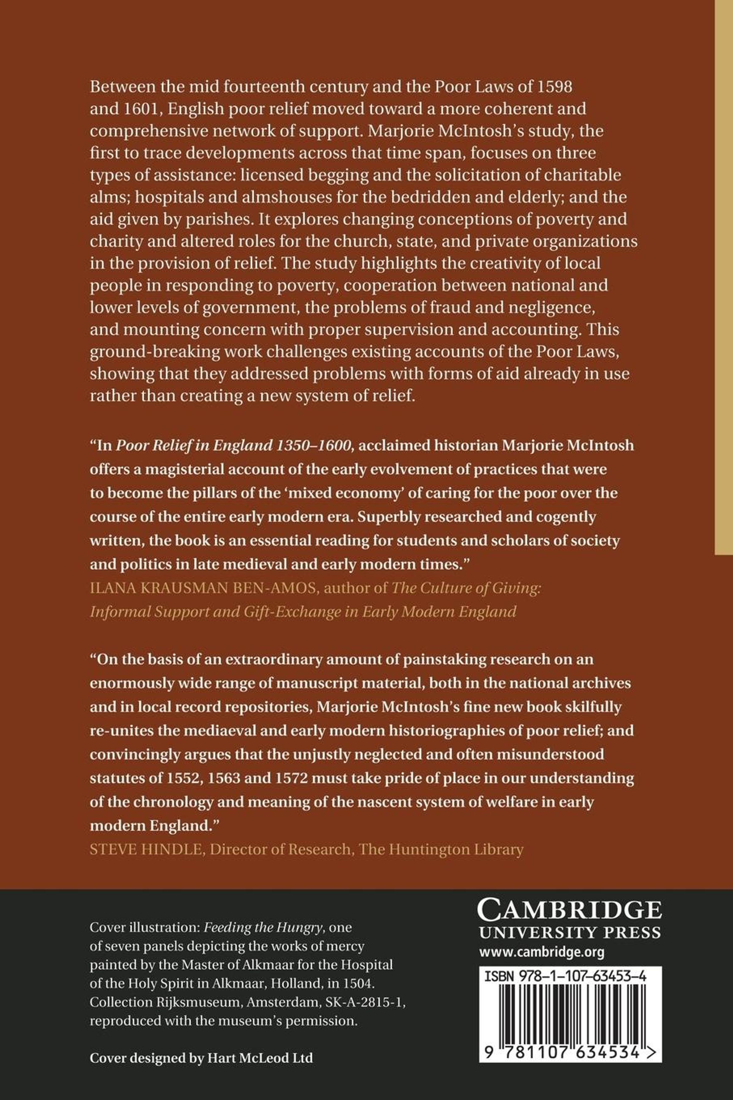 Between the mid-fourteenth century and the Poor Laws of 1598 and 1601, English poor relief moved toward a more coherent and comprehensive network of support. Marjorie McIntosh's study, the first to trace developments across that time span, focuses on three types of assistance: licensed begging and the solicitation of charitable alms; hospitals and almshouses for the bedridden and elderly; and the aid given by parishes. It explores changing conceptions of poverty and charity and altered roles for the church, state and private organizations in the provision of relief. The study highlights the creativity of local people in responding to poverty, cooperation between national levels of government, the problems of fraud and negligence, and mounting concern with proper supervision and accounting. This ground-breaking work challenges existing accounts of the Poor Laws, showing that they addressed problems with forms of aid already in use rather than creating a new system of relief.