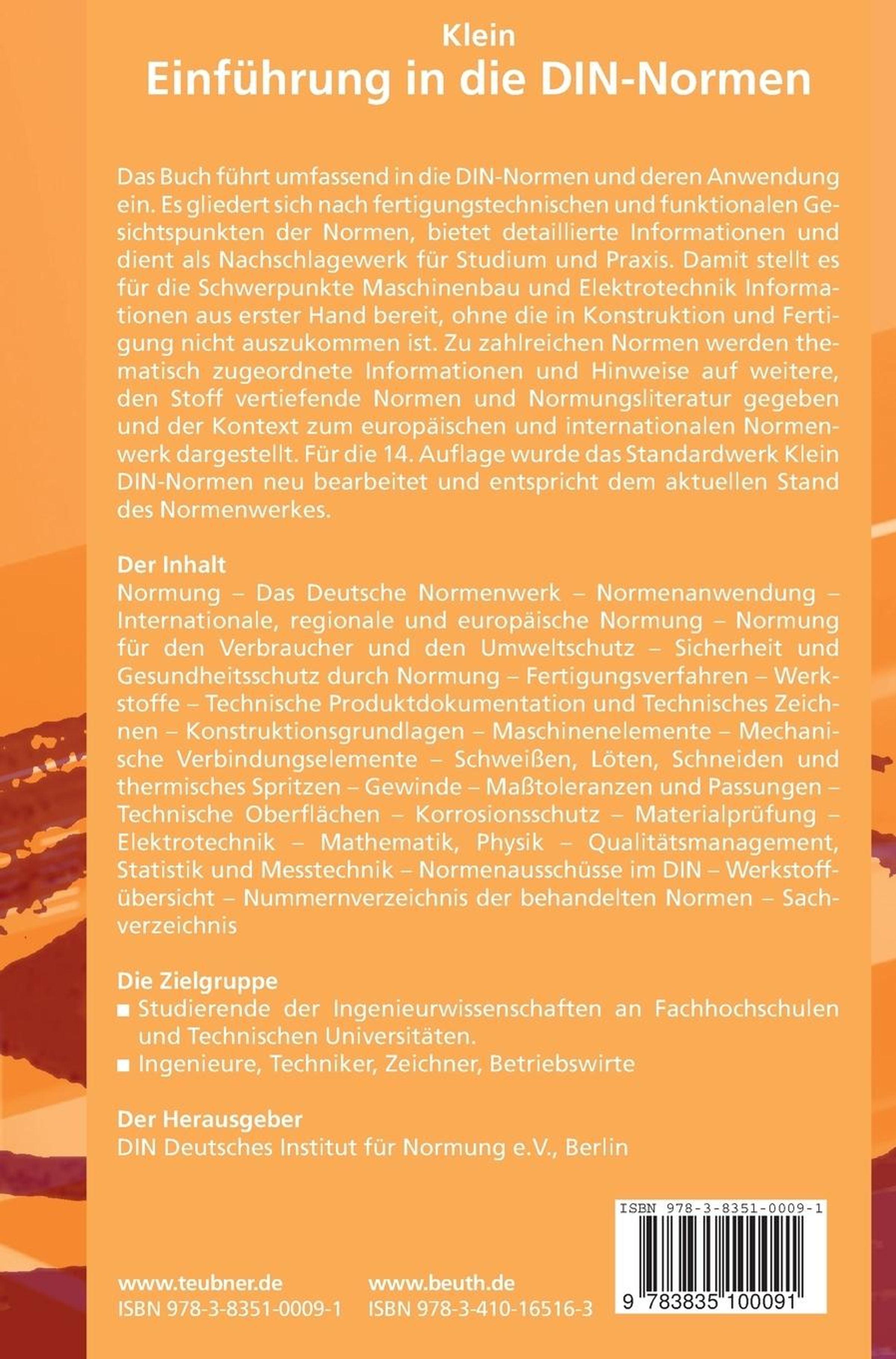 Das Buch führt umfassend in die DIN-Normen und deren Anwendung ein. Es gliedert sich nach fertigungstechnischen und funktionalen Gesichtspunkten der Normen, bietet detaillierte Informationen ist zuverlässiger Ratgeber bei der täglichen Arbeit. Damit stellt es schwerpunktmäßig für den Maschinenbau und die Elektrotechnik Informationen aus erster Hand bereit, ohne die in Konstruktion und Fertigung nicht auszukommen ist. Zu zahlreichen Normen werden thematisch zugeordnete Informationen und Hinweise auf weitere, den Stoff vertiefende Normen und Normungsliteratur gegeben und der Kontext zum europäischen und internationalen Normenwerk dargestellt. Für die 14. Auflage wurde das Standardwerk Klein DIN-Normen neu bearbeitet und entspricht dem aktuellen Stand des Normenwerkes.