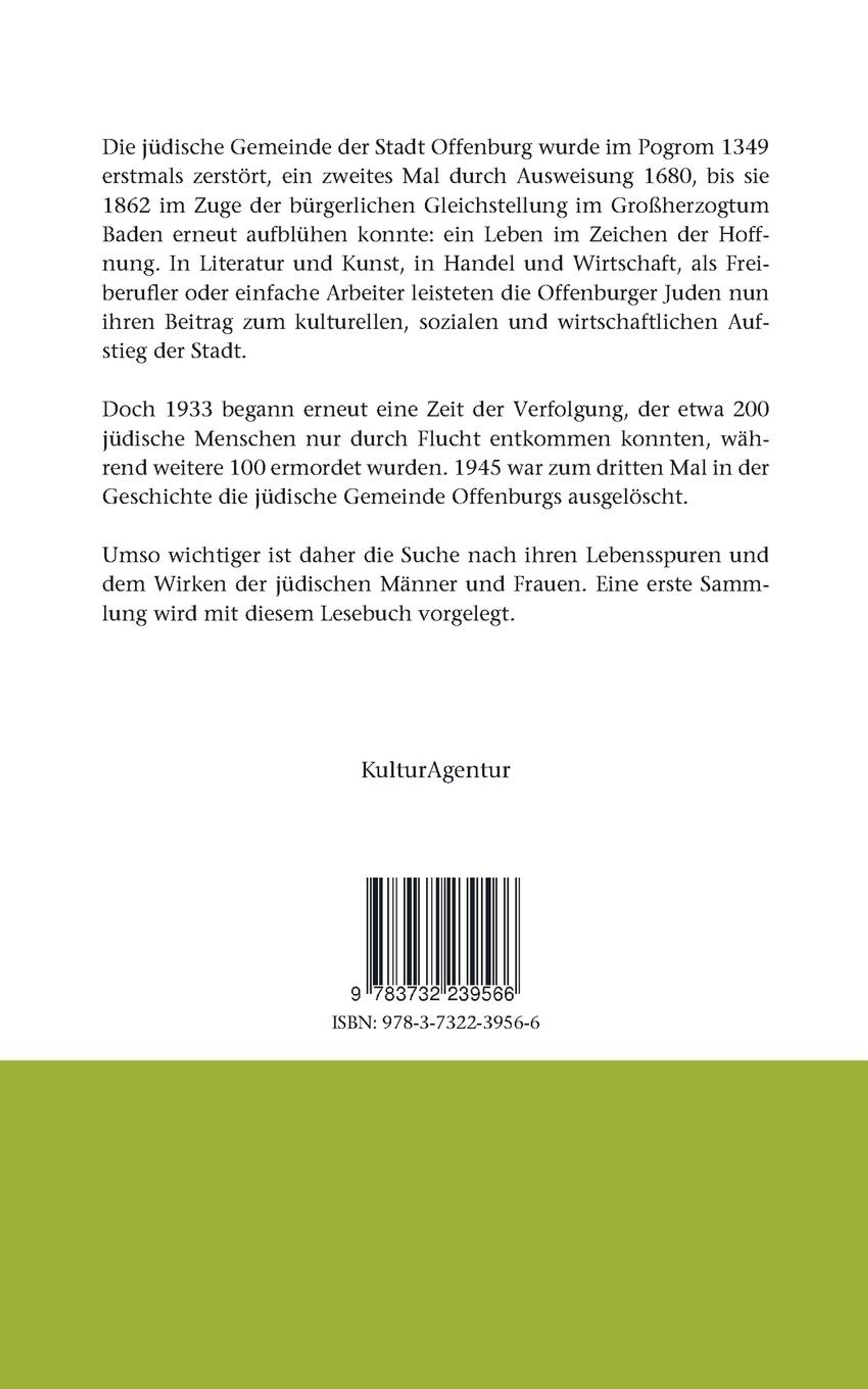 Die jüdische Gemeinde der Stadt Offenburg wurde im Pogrom 1349 erstmals zerstört, ein zweites Mal durch Ausweisung 1680, bis sie 1862 im Zuge der bürgerlichen Gleichstellung im Großherzogtum Baden erneut aufblühen konnte: ein Leben im Zeichen der Hoffnung. In Literatur und Kunst, in Handel und Wirtschaft, als Freiberufler oder einfache Arbeiter leisteten die Offenburger Juden nun ihren Beitrag zum kulturellen, sozialen und wirtschaftlichen Aufstieg der Stadt. Doch 1933 begann erneut eine Zeit der Verfolgung, denen etwa 200 jüdische Menschen nur durch Flucht entkommen konnten, während weitere 100 ermordet wurden. 1945 war zum dritten Mal in der Geschichte die jüdische Gemeinde Offenburgs ausgelöscht. Umso wichtiger ist daher die Suche nach ihren Lebensspuren und dem Wirken der jüdischen Männer und Frauen. Eine erste Sammlung wird mit diesem Lesebuch vorgelegt.