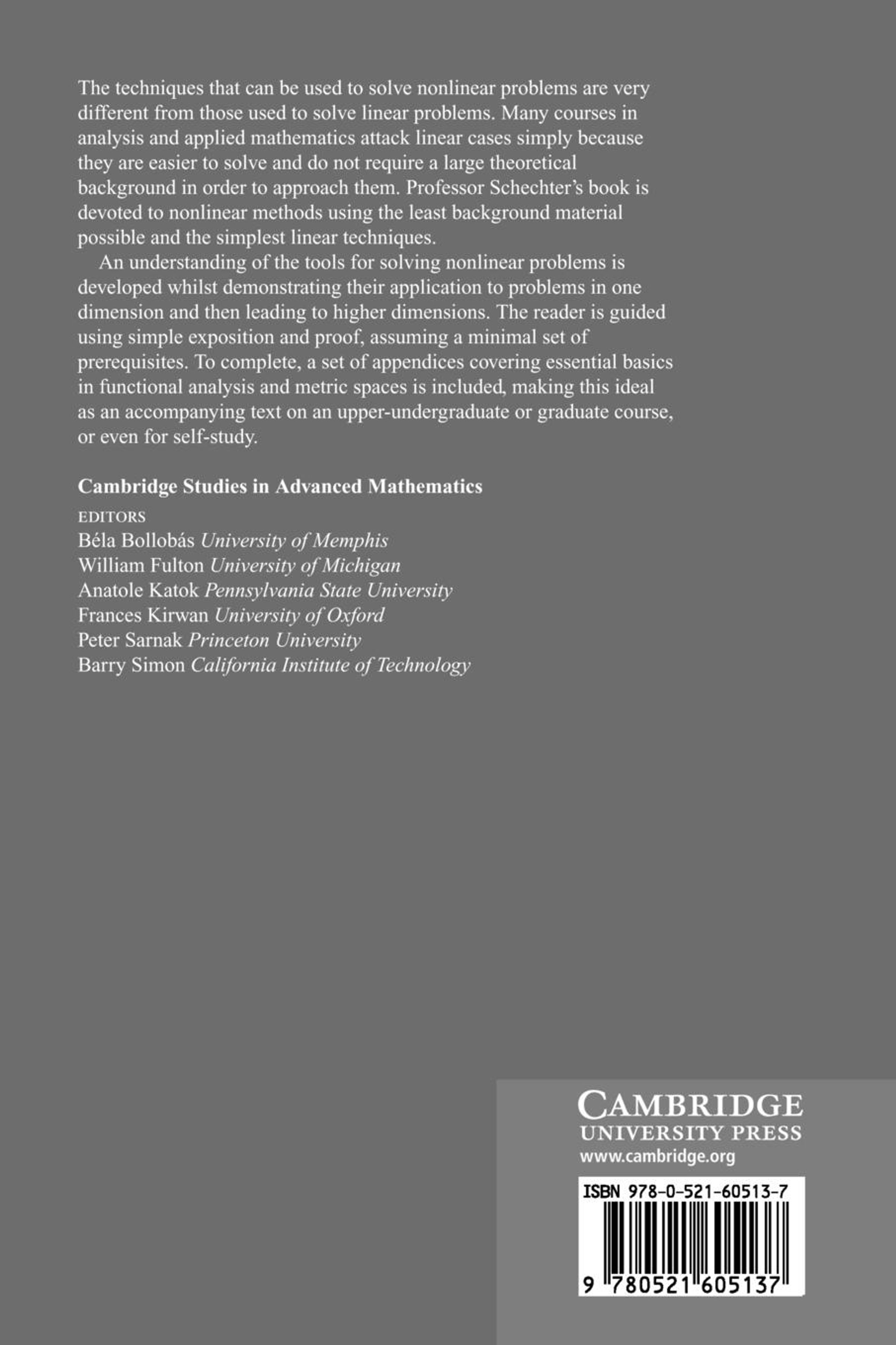 The techniques that can be used to solve non-linear problems are far different than those that are used to solve linear problems. Many courses in analysis and applied mathematics attack linear cases simply because they are easier to solve and do not require a large theoretical background in order to approach them. Professor Schechter's 2005 book is devoted to non-linear methods using the least background material possible and the simplest linear techniques. An understanding of the tools for solving non-linear problems is developed whilst demonstrating their application to problems in one dimension and then leading to higher dimensions. The reader is guided using simple exposition and proof, assuming a minimal set of pre-requisites. For completion, a set of appendices covering essential basics in functional analysis and metric spaces is included, making this ideal as an accompanying text on an upper-undergraduate or graduate course, or even for self-study.