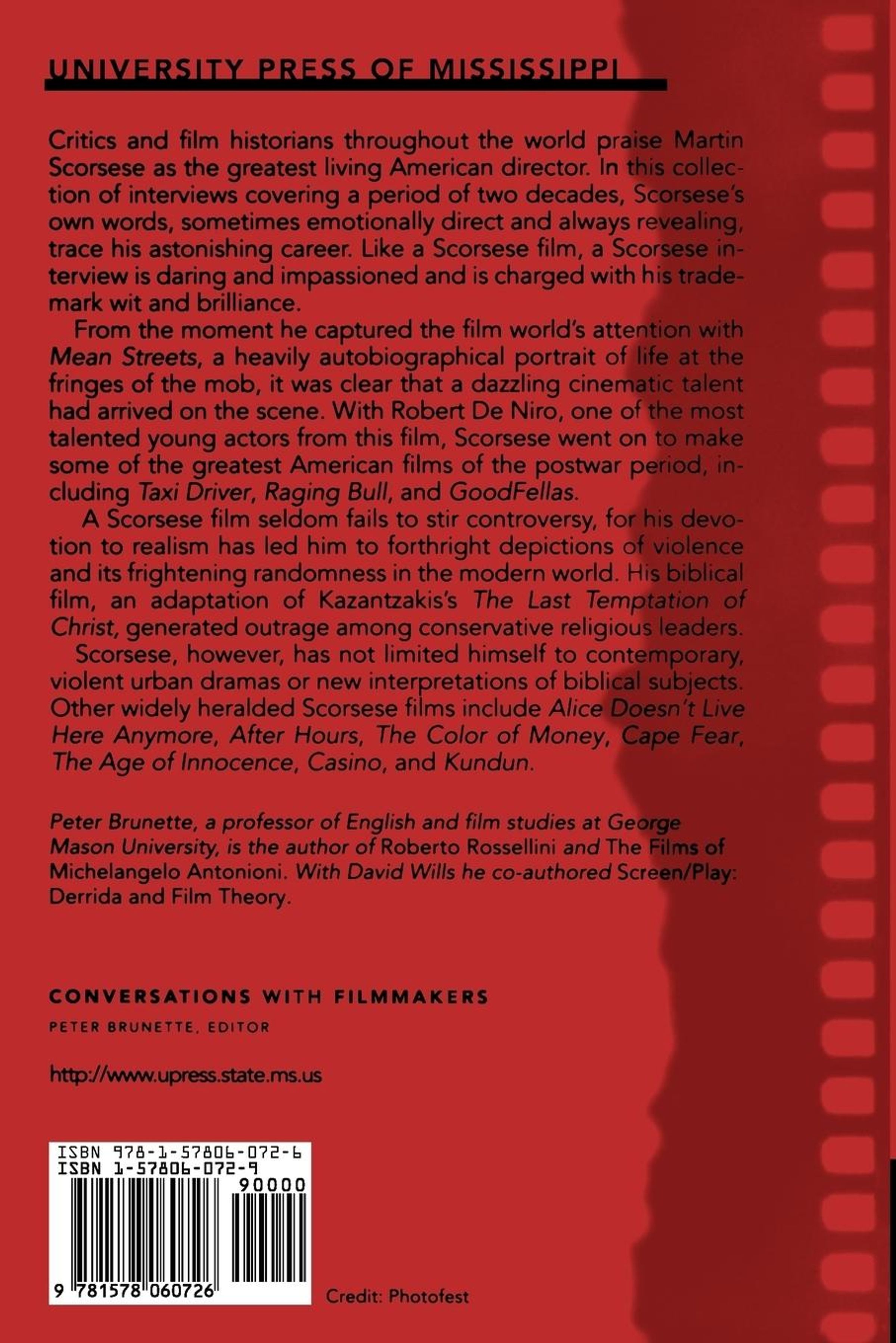 From the moment he captured the film world's attention with Mean Streets (1973), a portrait of life at the fringes of the Mob, it was clear that a dazzling cinematic talent had arrived on the scene. With Robert DeNiro, one of the most talented young actors from this film, Scorsese went on to make some of the greatest American films of the postwar period, including Taxi Driver (1976), Raging Bull (1980), and Goodfellas (1990). A Scorsese film seldom fails to stir controversy, for his devotion to realism has led him to forthrightly depict violence and its frightening randomness in the modern world. His biblical film also created quite a stir. This adaptation of Kazantzakis's The Last Temptation of Christ generated outrage among conservative religious leaders. Scorsese, however, has not limited himself to contemporary, violent urban dramas or new interpretations of biblical subjects. Other widely heralded Scorsese films include Alice Doesn't Live Here Anymore (1974), New York, New York (1977), The Last Waltz (1978), The King of Comedy (1983), After Hours (1985), The Color of Money (1986), Cape Fear (1991), The Age of Innocence (1993), Casino (1995), and Kundun (1998). These interviews begin with conversations about the highly autobiographical Mean Streets (1973), which first brought Scorsese serious attention, and end with conversations about Kundun , an overtly political biography of the Dalai Lama of Tibet, released in early 1998. ""I look for a thematic idea running through my movies, he says, and I see that it's the outsider struggling for recognition. I realize that all my life I've been an outsider, and above all, being lonely but never realizing it."" Peter Brunette , a professor of English and film studies at George Mason University, is the author of Roberto Rossellini and (forthcoming) The Films of Michelangelo Antonioni . With David Wills he co-authored Screen / Play: Derrida and Film Theory.