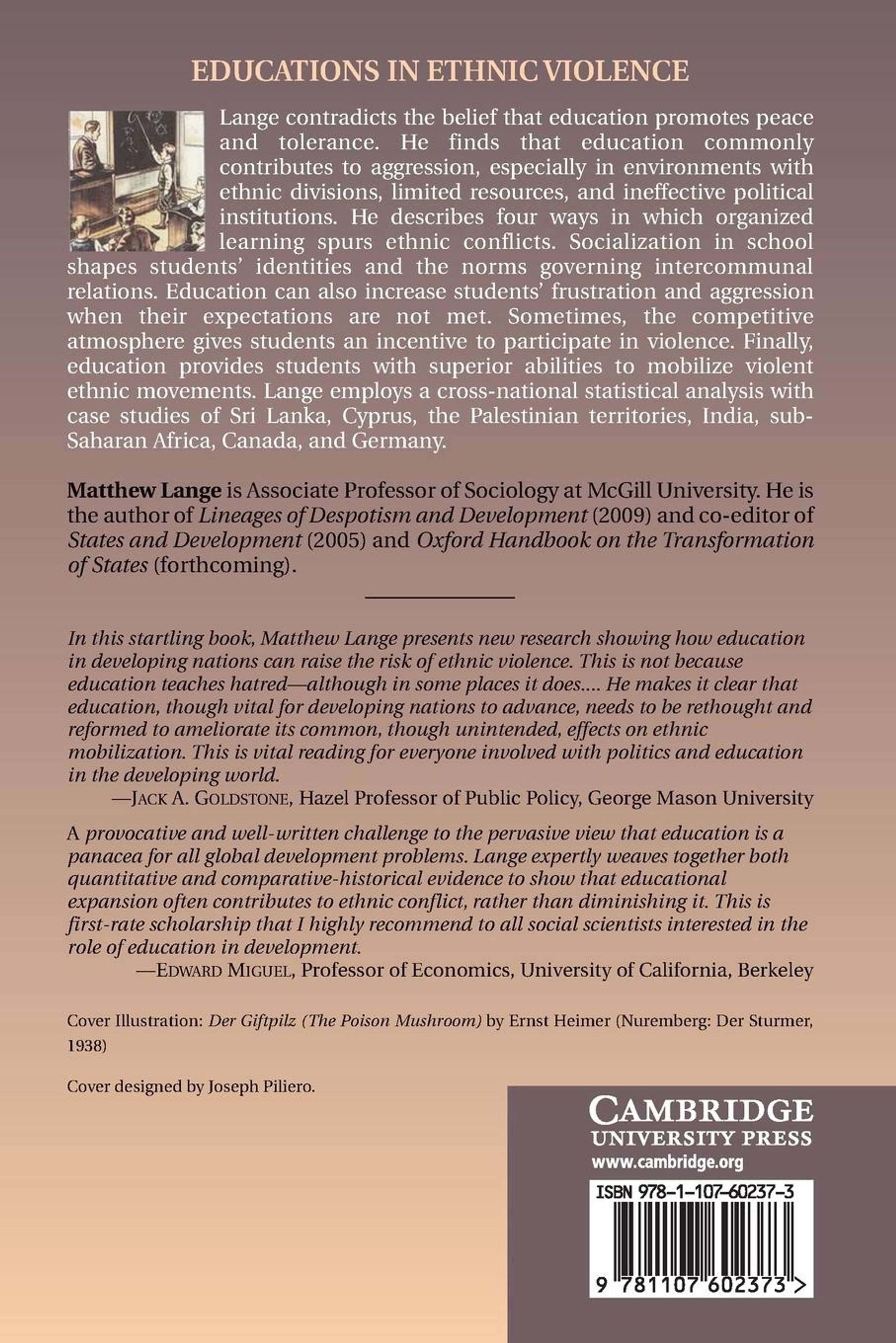 In Educations in Ethnic Violence, Matthew Lange explores the effects education has on ethnic violence. Lange contradicts the widely held belief that education promotes peace and tolerance. Rather, Lange finds that education commonly contributes to aggression, especially in environments with ethnic divisions, limited resources and ineffective political institutions. He describes four ways in which organized learning spurs ethnic conflicts. Socialization in school shapes students' identities and the norms governing intercommunal relations. Education can also increase students' frustration and aggression when their expectations are not met. Sometimes, the competitive atmosphere gives students an incentive to participate in violence. Finally, education provides students with superior abilities to mobilize violent ethnic movements. Lange employs a cross-national statistical analysis with case studies of Sri Lanka, Cyprus, the Palestinian territories, India, sub-Saharan Africa, Canada and Germany.