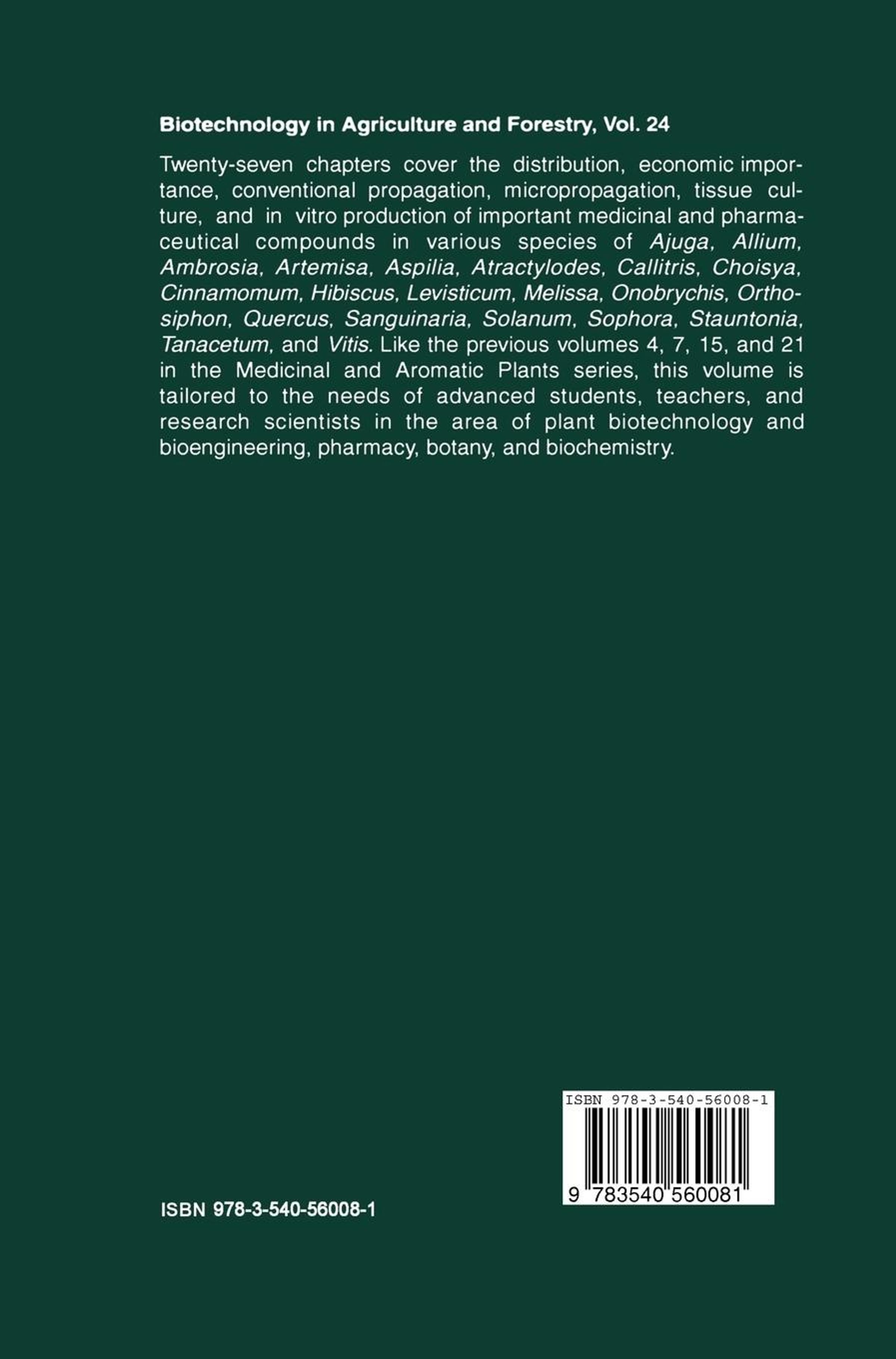 27 chapter cover the distribution, economic importance, conventional propagation, micropropagation, tissue culture, and in vitro production of important medicinal and pharmaceutical compounds in various species of Ajuga, Allium, Ambrosia, Artemisia, Aspilia, Atractylodes, Callitris, Choisya, Cinnamomum, Coluria, Cucumis, Drosera, Daucus, Eustoma, Fagopyrum, Hibiscus, Levisticum, Onobrychis, Orthosiphon, Quercus, Sanguinaria, Solanum, Sophora, Stauntonia, Tanecetum, Vetiveria, and Vitis. Like the previous volumes 4, 7, 15, and 21 in the Medicinal and Aromatic Plants series, the volume is tailored to the need of advanced students, teachers, and research scientists in the area of plant biotechnology andbioengineering, pharmacy, botany and biochemistry.