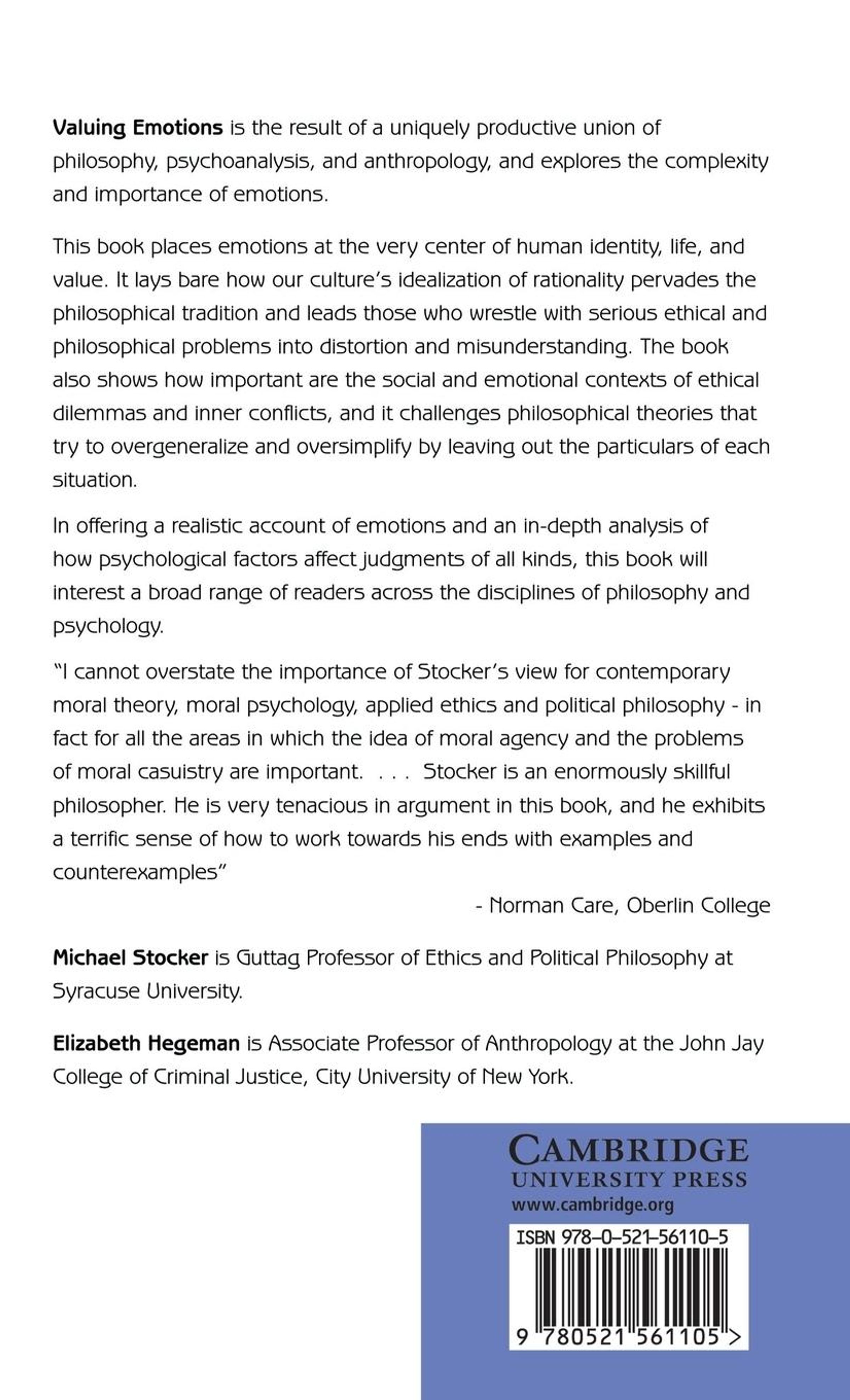 This 1996 book is the result of a uniquely productive union of philosophy, psychoanalysis and anthropology, and explores the complexity and importance of emotions. Michael Stocker places emotions at the very centre of human identity, life and value. He lays bare how our culture's idealisation of rationality pervades the philosophical tradition and leads those who wrestle with serious ethical and philosophical problems into distortion and misunderstanding. Professor Stocker shows how important are the social and emotional contexts of ethical dilemmas and inner conflicts, and he challenges philosophical theories that try to overgeneralise and over-simplify by leaving out the particulars of each situation. In offering a realistic account of emotions and an in-depth analysis of how psychological factors affect judgments of all kind, this book will interest a broad range of readers across the disciplines of philosophy and psychology.