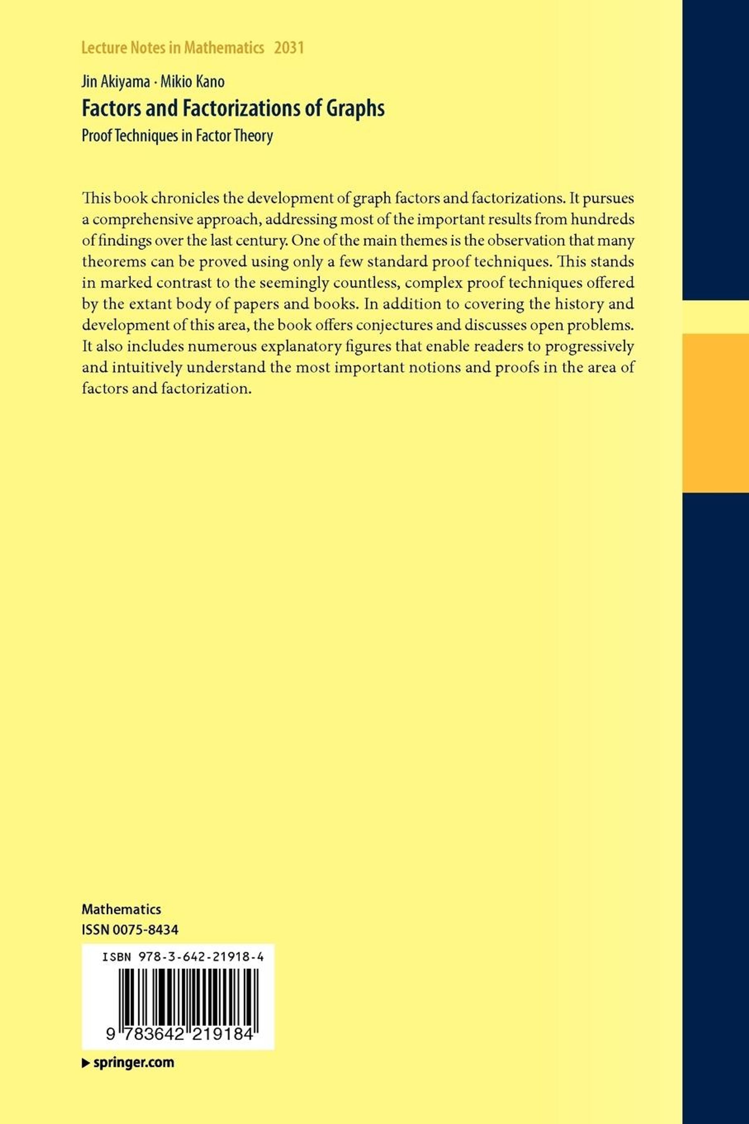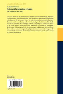 This book chronicles the development of graph factors and factorizations. It pursues a comprehensive approach, addressing most of the important results from hundreds of findings over the last century. One of the main themes is the observation that many theorems can be proved using only a few standard proof techniques. This stands in marked contrast to the seemingly countless, complex proof techniques offered by the extant body of papers and books. In addition to covering the history and development of this area, the book offers conjectures and discusses open problems. It also includes numerous explanatory figures that enable readers to progressively and intuitively understand the most important notions and proofs in the area of factors and factorization.