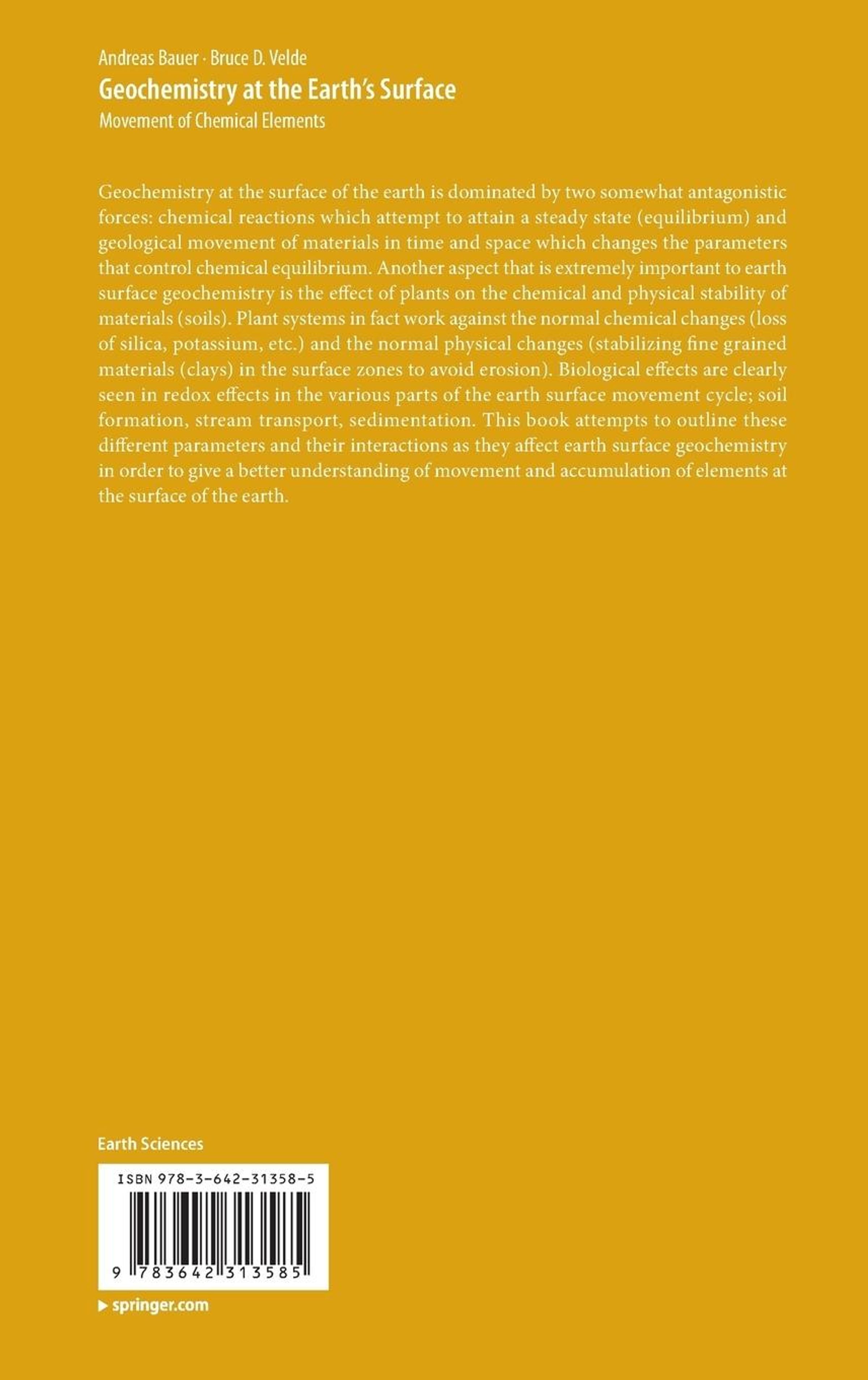 Geochemistry at the surface of the earth is dominated by two somewhat antagonistic forces: chemical reactions which attempt to attain a steady state (equilibrium) and geological movement of materials in time and space which changes the parameters that control chemical equilibrium. Another aspect that is extremely important to earth surface geochemistry is the effect of plants on the chemical and physical stability of materials (soils). Plant systems in fact work against the normal chemical changes (loss of silica, potassium, etc.) and the normal physical changes (stabilizing fine grained materials (clays) in the surface zones to avoid erosion). Biological effects are clearly seen in redox effects in the various parts of the earth surface movement cycle; soil formation, stream transport, sedimentation. This book attempts to outline these different parameters and their interactions as they affect earth surface geochemistry in order to give a better understanding of movement and accumulation of elements at the surface of the earth.