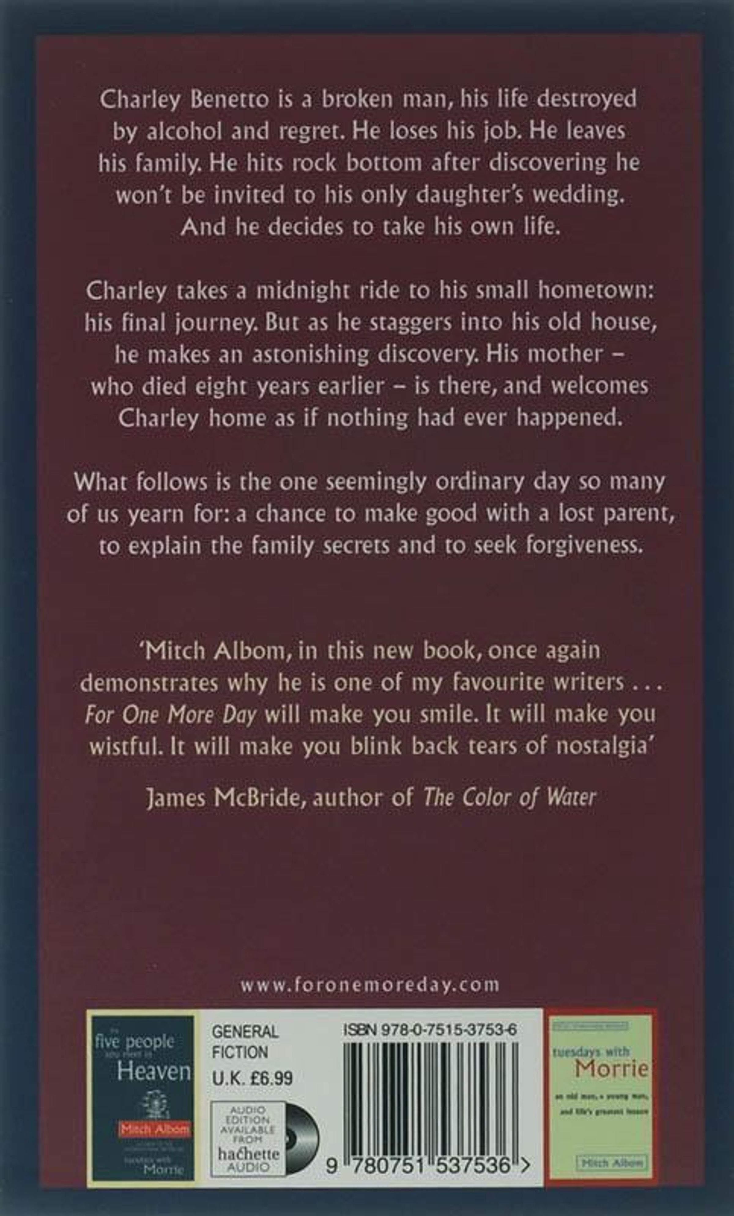 This is the story of a man named Charley who loses his job, leaves his family, and decides, one night, to end his life. Somewhere between this world and the next, he encounters his mother, who died years ago, and he spends one last day with her - a day he never had on earth. This 'ordinary' day covers the whole of their existence, and reveals how Charley, like many children, was constantly forced to choose between his mother and his father. He gets the chance many of us yearn for - to ask the questions never asked while our parents are alive. In the end, Charley learns how little he really knew about his mother, how her love saved their family, and how deeply he wants the chance to save his own.