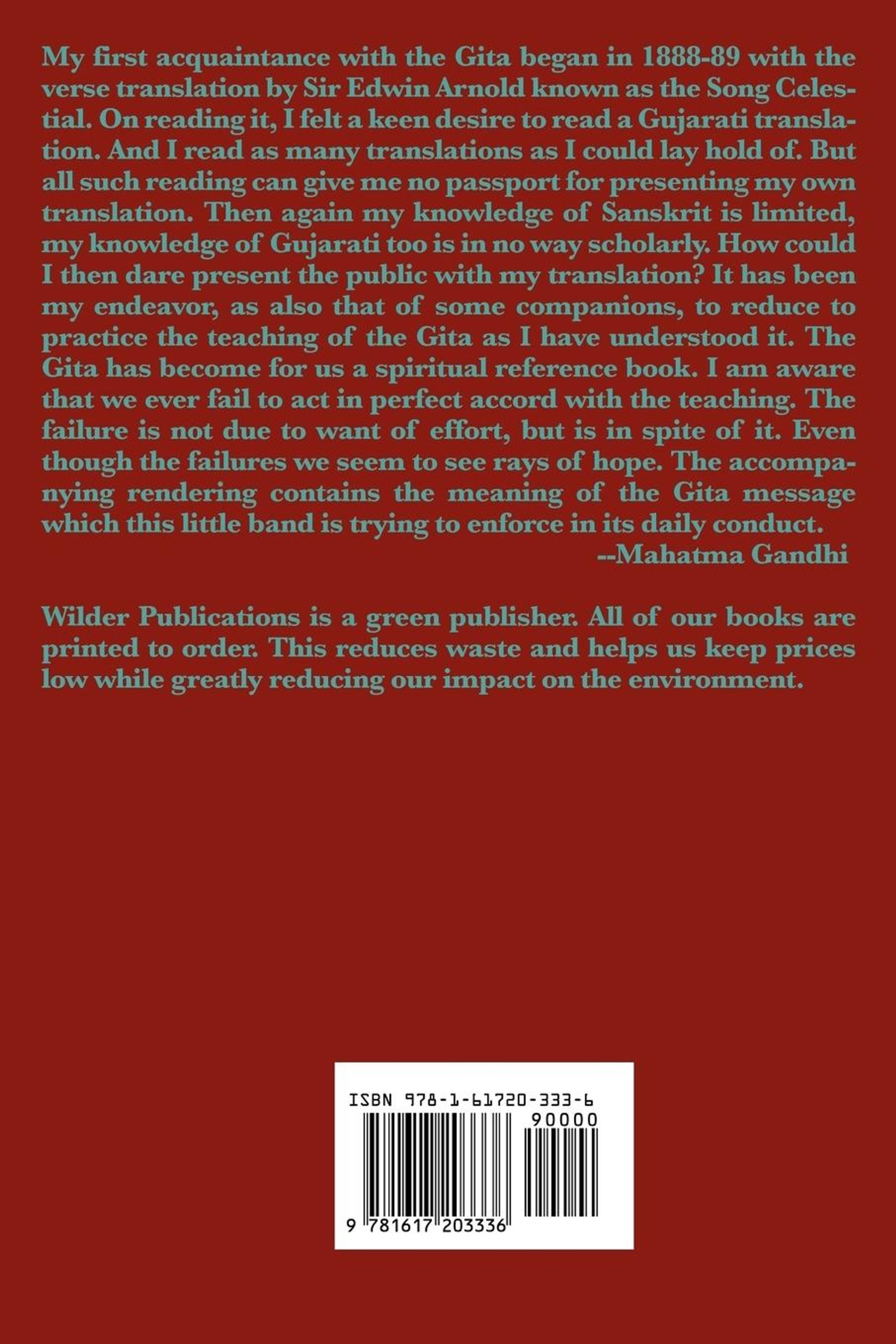My first acquaintance with the Gita began in 1888-89 with the verse translation by Sir Edwin Arnold known as the Song Celestial. On reading it, I felt a keen desire to read a Gujarati translation. And I read as many translations as I could lay hold of. But all such reading can give me no passport for presenting my own translation. Then again my knowledge of Sanskrit is limited, my knowledge of Gujarati too is in no way scholarly. How could I then dare present the public with my translation? It has been my endeavor, as also that of some companions, to reduce to practice the teaching of the Gita as I have understood it. The Gita has become for us a spiritual reference book. I am aware that we ever fail to act in perfect accord with the teaching. The failure is not due to want of effort, but is in spite of it. Even though the failures we seem to see rays of hope. The accompanying rendering contains the meaning of the Gita message which this little band is trying to enforce in its daily conduct.--Mahatma Gandhi